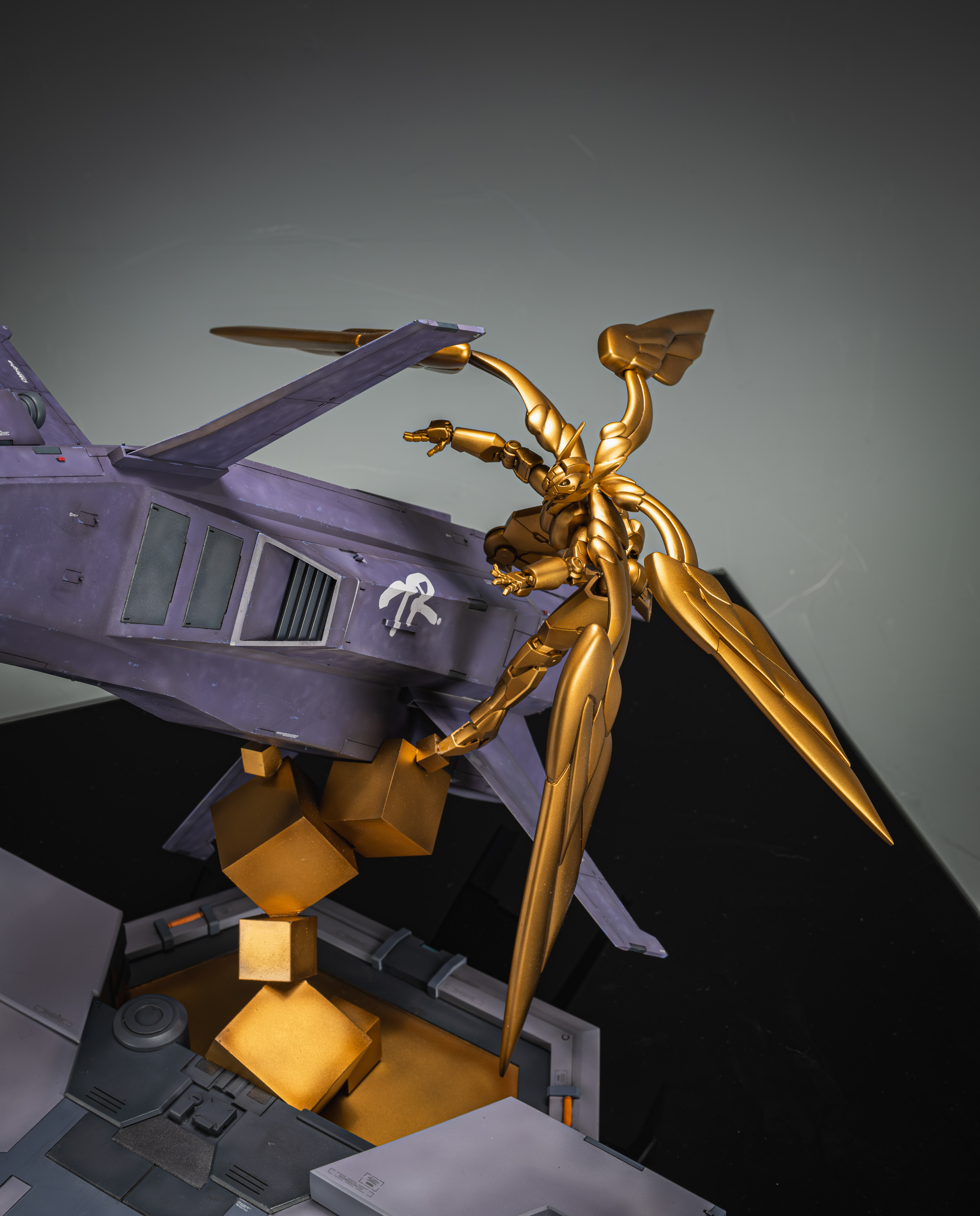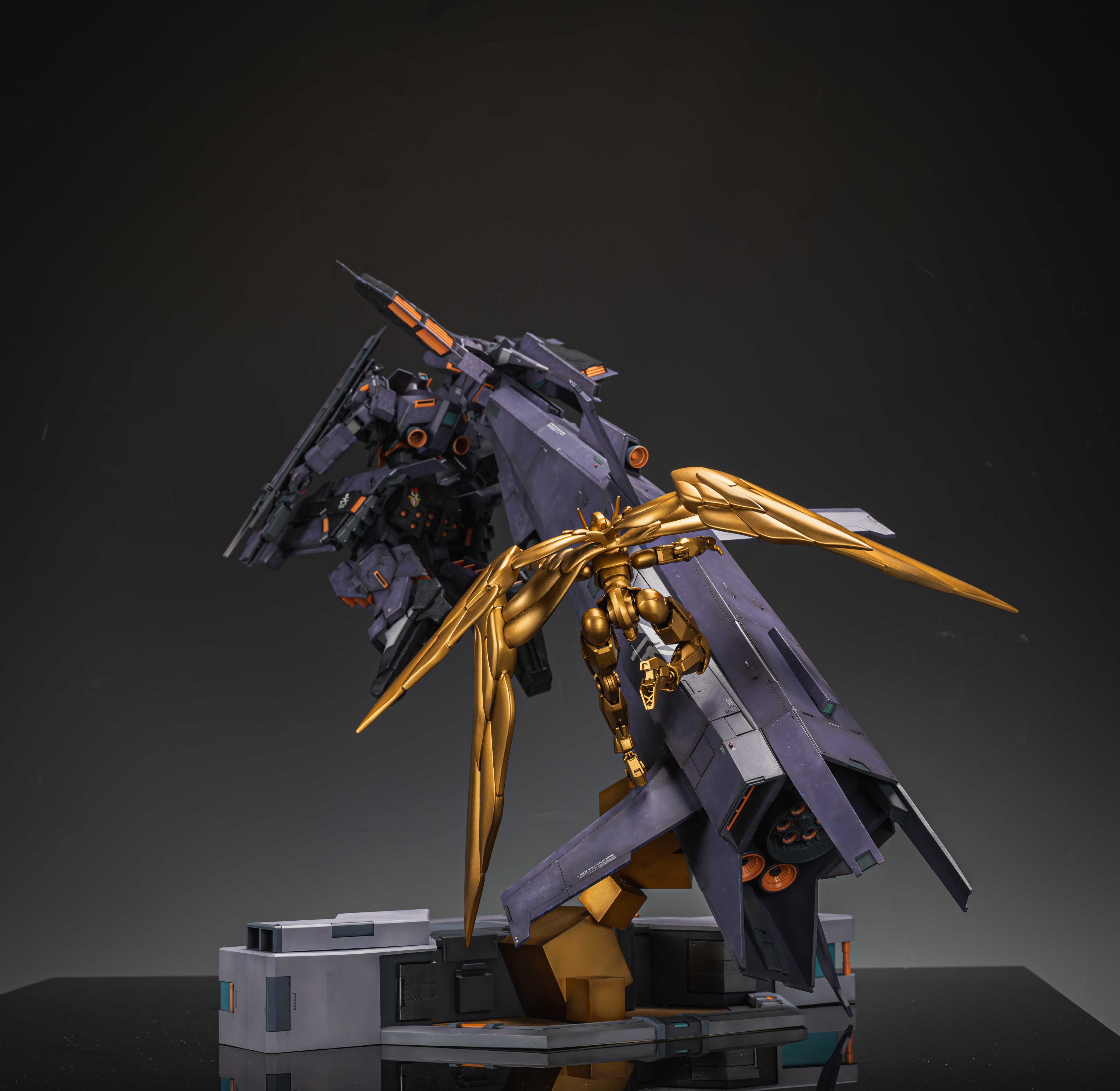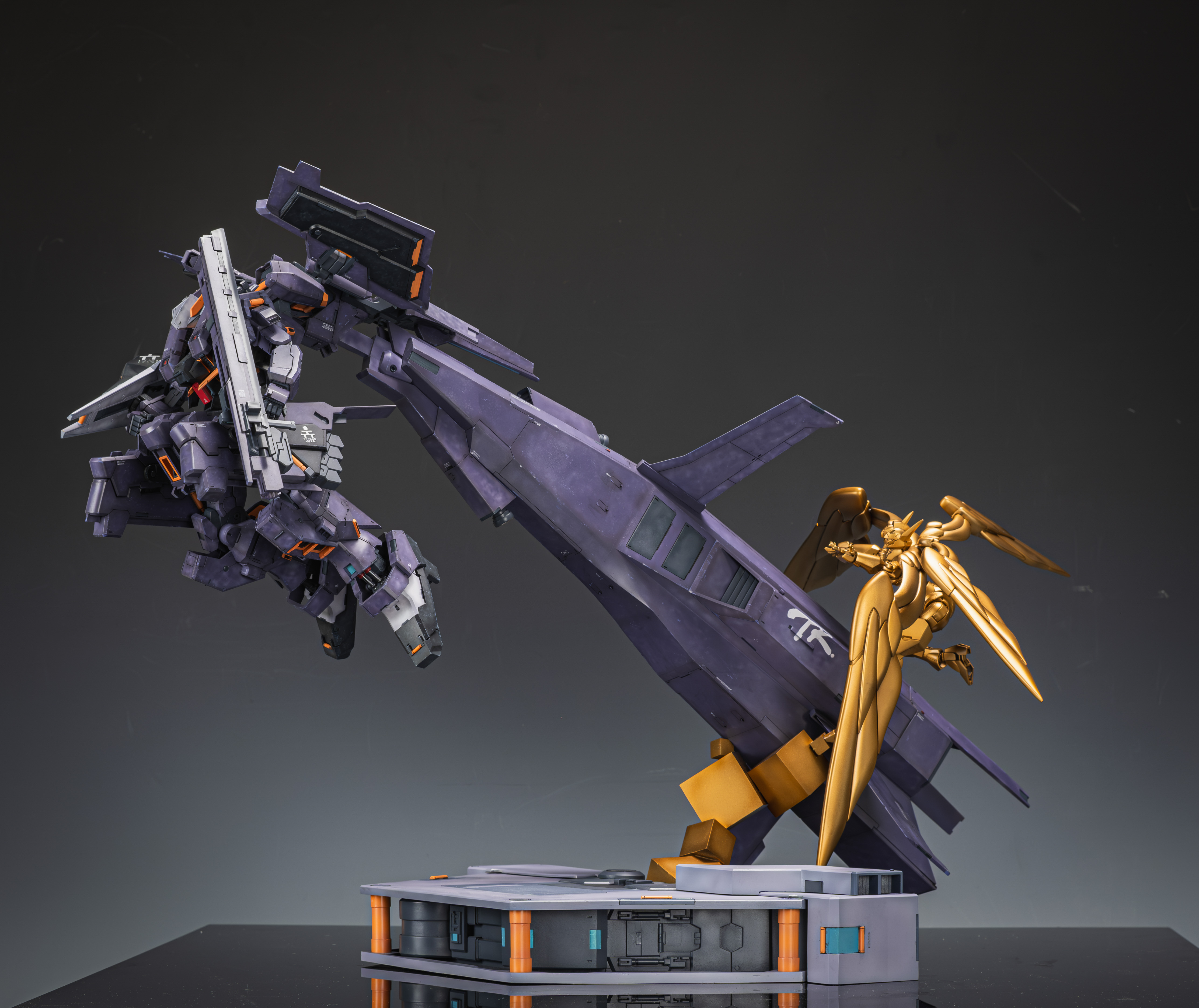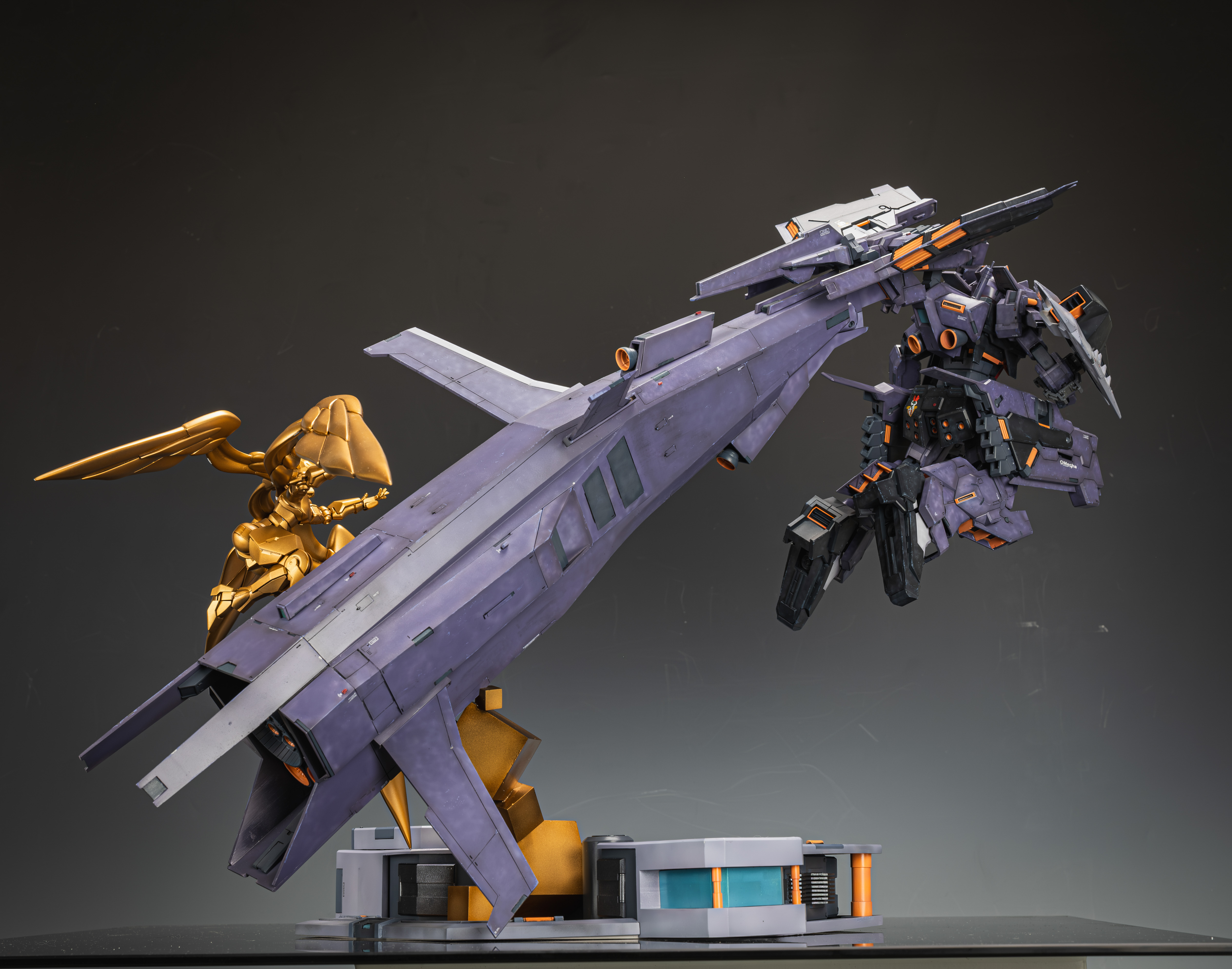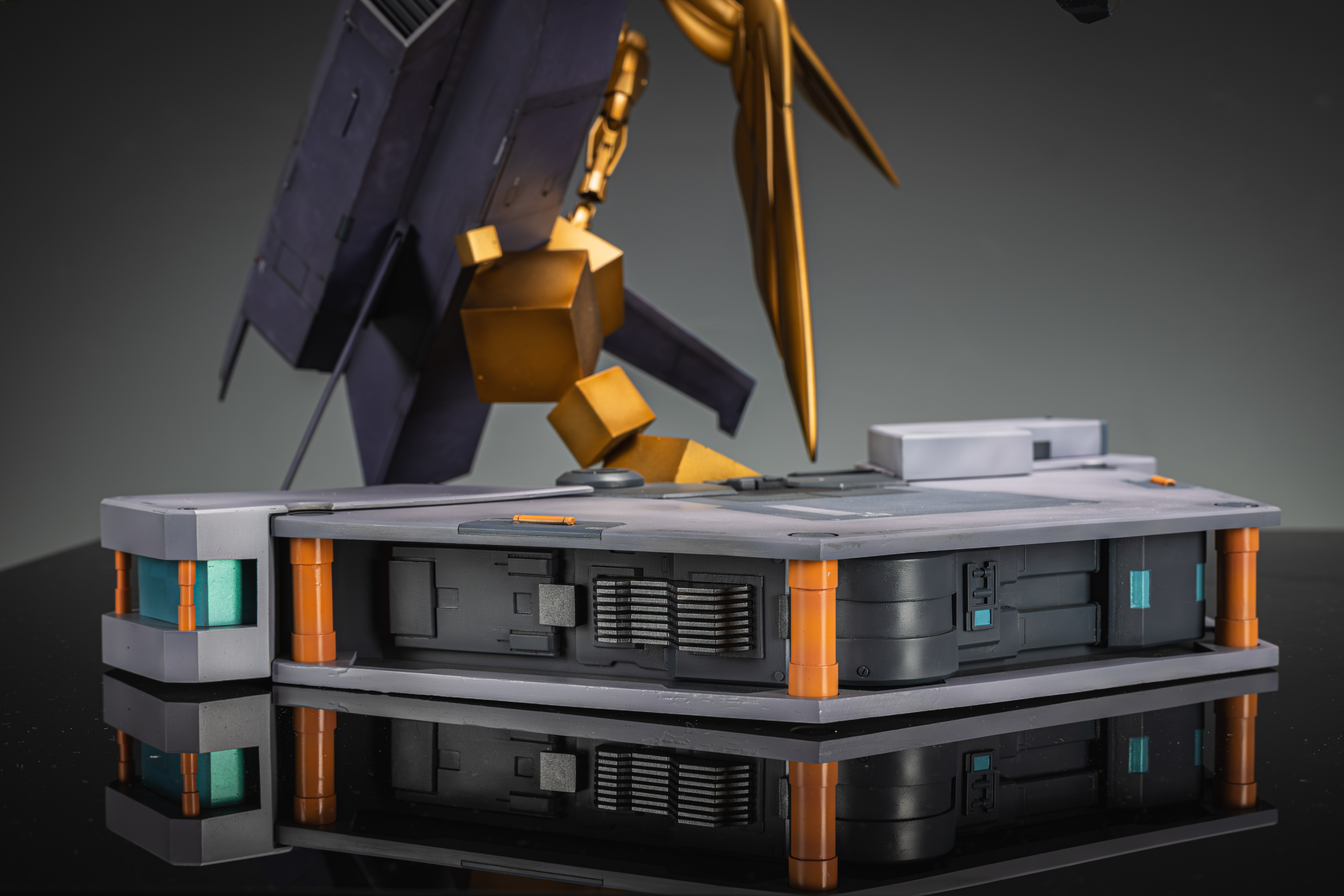 海兹尔奥斯拉搭载巡航推进装置以突进姿态抵达前线。地台灵感来自于海兹尔实验型的头部构造,其头部焕发金色光辉精神力幻化出女神形象以环绕庇佑奥斯拉行进,承载着希冀抵达前线。从实验型到实战型的传递火炬并未消逝,而是精神力的形式相互联结,是传承,是庇佑,更是希冀,是战时前线仿佛能带来和平的那一抹耀眼的曙光。