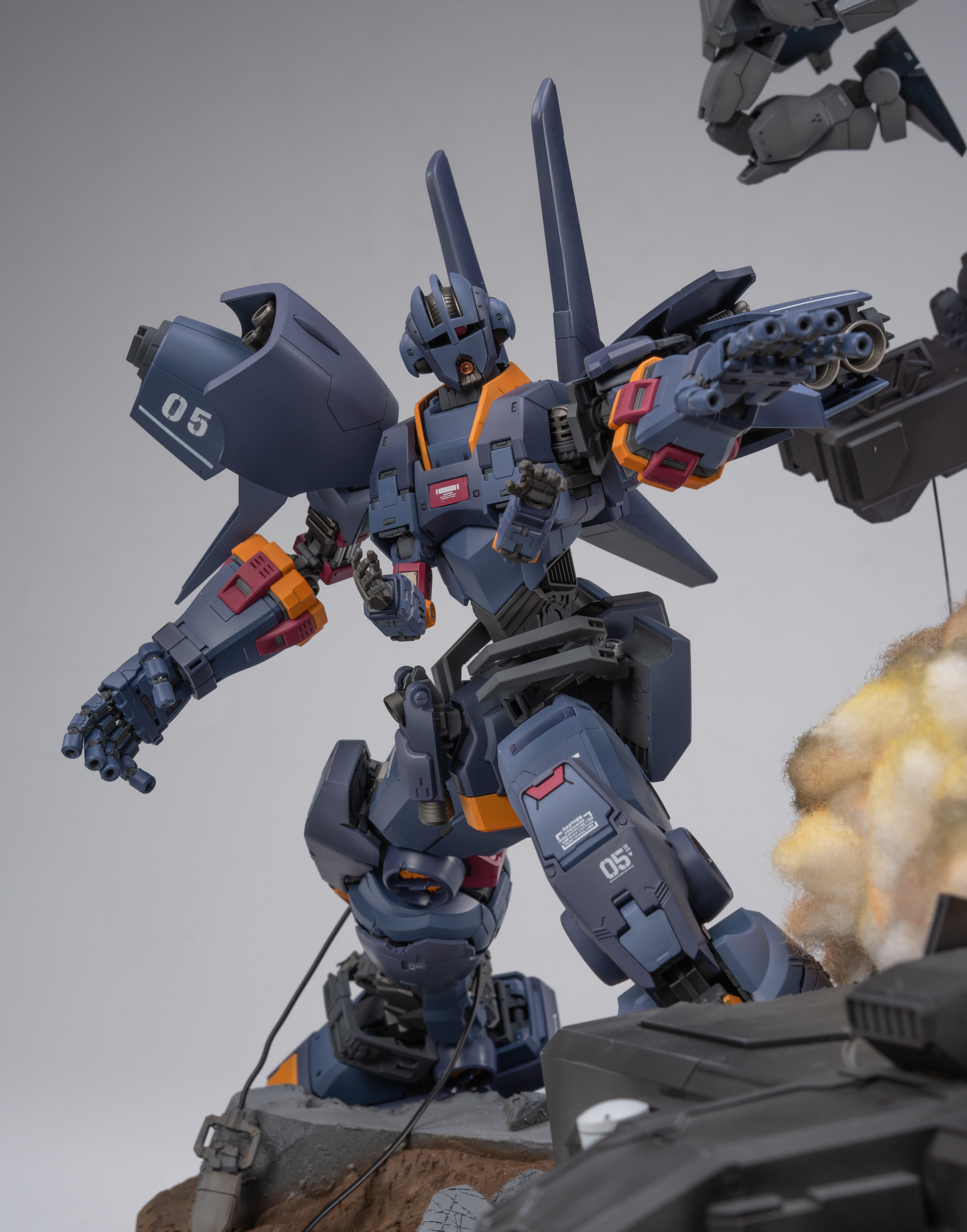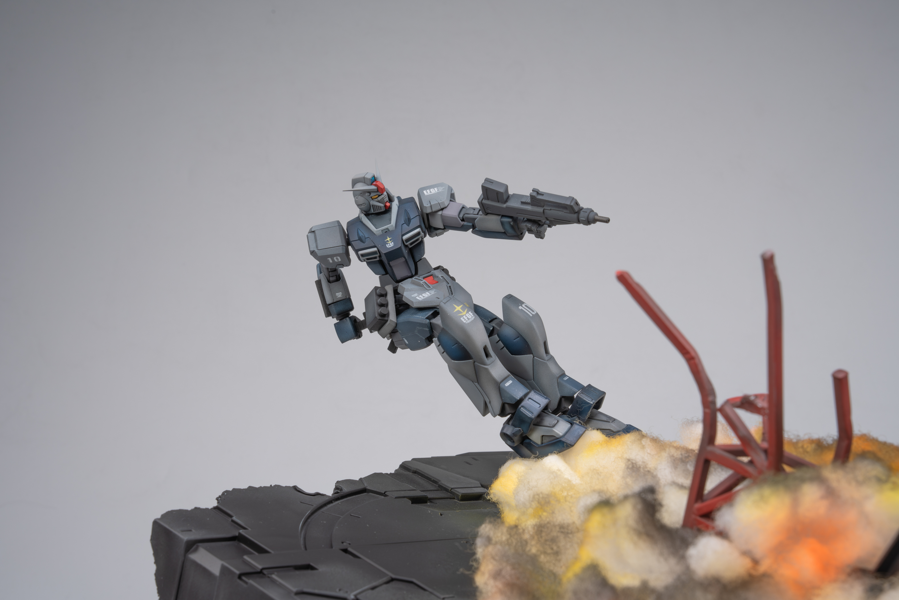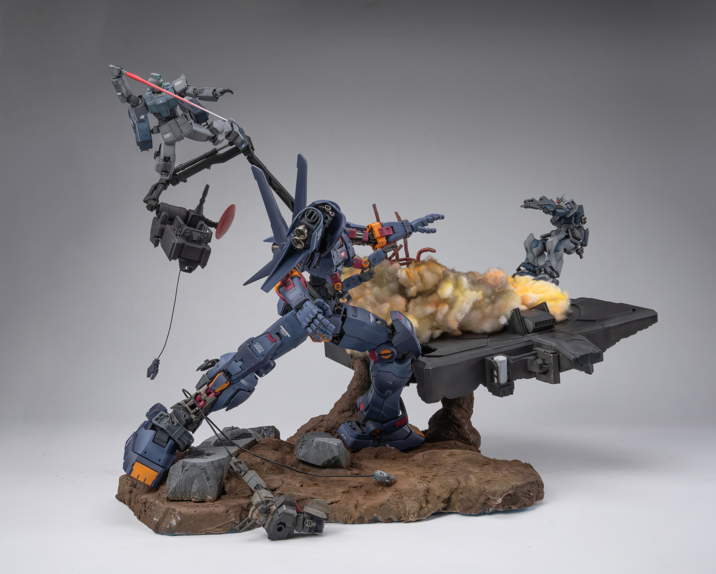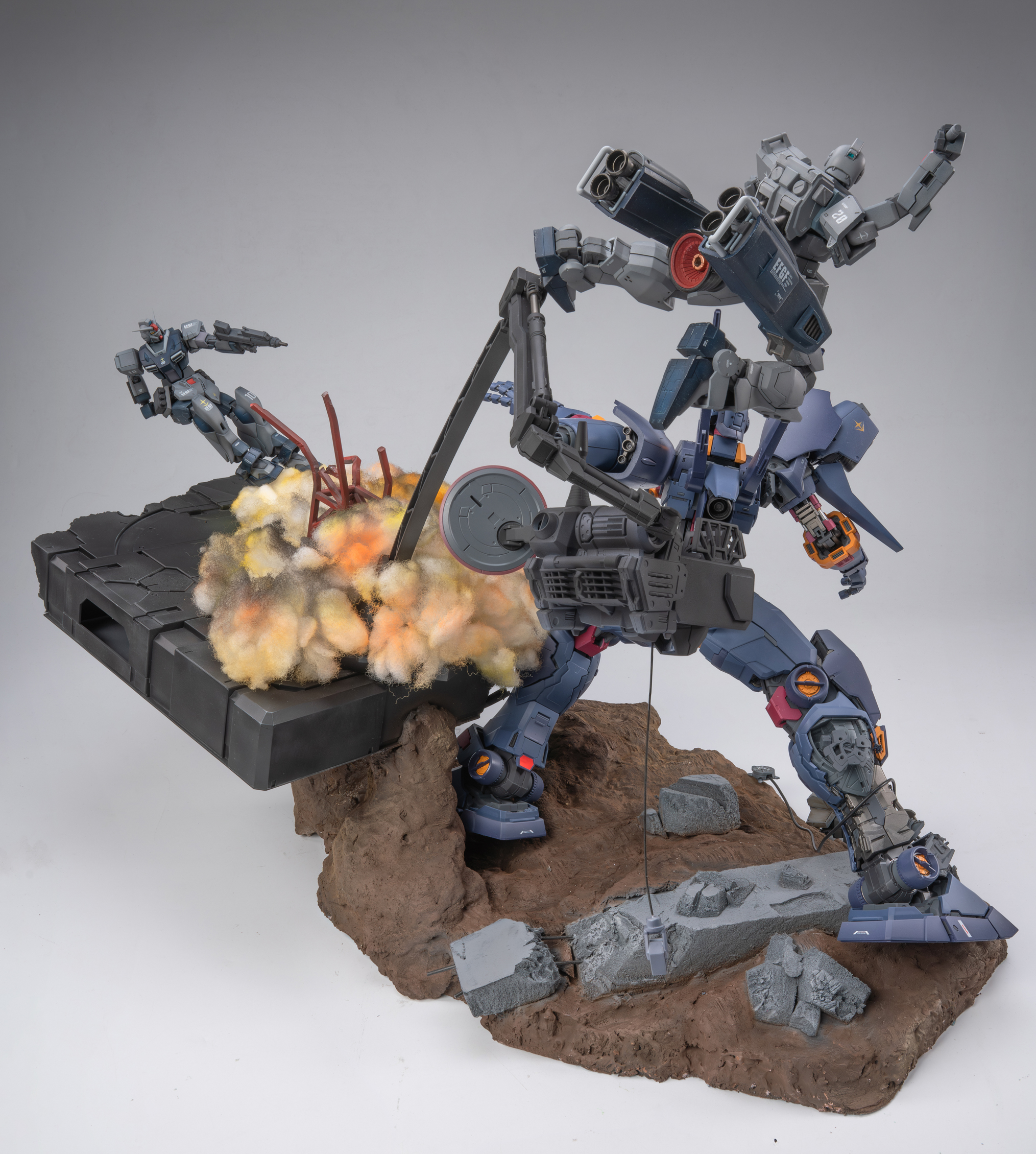 背景故事 以作品《missing link》为背景,想象在架空世界平行宇宙中,奴隶幽灵的远程火力支援机驾驶员“bomber”逃往宇宙后,在中立殖民卫星作为难民生活,在uc0087年又一次见证提坦斯的镇暴吉姆驱赶难民向难民开火后,他回忆起了曾经被吉翁与联邦同时追猎的经历。梦中,屠杀平民的吉姆以他心中最恐惧的姿态出现在曾经的战场,联邦的白色死神和吉翁的最终兵器融为一体,以铺天盖地的恶魔之躯袭来,经历奴灵的大破与基地的受损后,面对以高机动性与巨物缠斗的精灵高达,战斗的勇气终于战胜了一直以来的怯懦,在恶魔的注意力被精灵高达吸引时,吉姆借助一次性的飞行装置跃起,拔出光束军刀瞄准眼前的敌人,发起了最后的冲锋 “他们是猎物,我们才是猎人” 改造思路 陆战吉姆改造 混搭使用 hg pb奴灵陆战吉姆 hg 陆战高达 hg巴巴托斯第六形态 hg pb红色三巨星小队 hg pb苍白骑士陆战型 rg 吉翁号 将原吉姆的降落伞背包推进器配合rg吉翁号喷口制作挂载在腰间的复合飞行装置 大量填偷胶 将脚底纹路重新刻线制作 胸甲用ab补土重新塑形 达到类似乔巴姆装甲的效果 腿部加长3mm 大腿加粗1mm 达到更壮硕的比例效果 脚部重新塑形制作卡味铲子脚 部分细节削除 设计制作一定量刻线 整体无缝阴影喷涂 奴灵高达剪取上胸部分进行无缝阴影喷涂旧化 精灵高达改造 混搭使用 hg 精灵高达 hg 陆战高达 hg马克兔 hg 狙击吉姆 hg 死神 hg z hg 红色三巨星小队 rg能天使 胯部替换成死神高达的胯部 增高1mm的同时获得了可观的弯腰可动 同时将肩甲替换成狙击吉姆的肩甲使比例更轻盈小巧 使用能天使的后裙甲结构将光束匕首挂载在机体后方 侧裙甲则替换为红色三巨星小队的榴弹 加装狙击吉姆和z高达的喷口使其更符合高机动近战特化机体的设定 裙甲用马克兔裙甲重新塑形 整体线条更流畅 部分细节削除 设计制作一定量刻线 整体无缝阴影喷涂 增加分色 吉翁号改造 混搭使用 rg 吉翁号 rg 元祖2.0 hg 强袭杰刚 hg 铁奥 hg 拜亚兰特装型 hg 海军陆战队格鲁古古 mg 原石新安洲 mg 吉姆狙击特装型 mg 元祖3.0 mg gnx进阶型 mg 格鲁古古2.0 mg age1标准型 pgu 元祖 主要改造是将rg吉翁号加上pgu元祖的腿 用ab补土重置关节以保证可动与造型比例 在胸口加装rg元祖2.0的手臂 呼应改造的主题 将多款套件的内构进行混搭呈现出比较饱满的外露内构造型 上半身使用拜亚兰和铁奥的零件视觉上扩宽比例 部分细节消除 设计制作一定量刻线 整体无缝CM喷涂 场景制作 混搭使用 pg 能天使 pgu 元祖 pg 独角兽 pg 完美强袭 hg 强袭杰刚 hg 铁球 hg 海因德里 hg 陆战吉姆奴灵机 hg 拜亚兰特装型 mg 原石新安洲 mg 元祖3.0 mg 自由2.0 mg 杰斯塔 以泡沫板搭建第一层框架 以pg能天使地台搭建基地场景 以pg完美强袭背包机械臂,pgu元祖核心战机,mg自由2.0支架,hg海因德里进行混搭