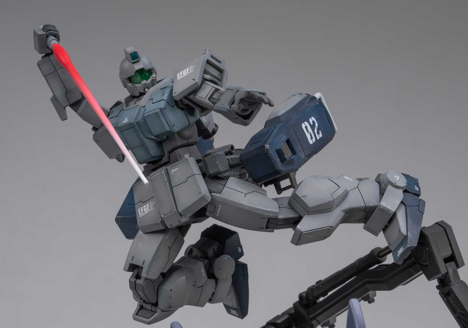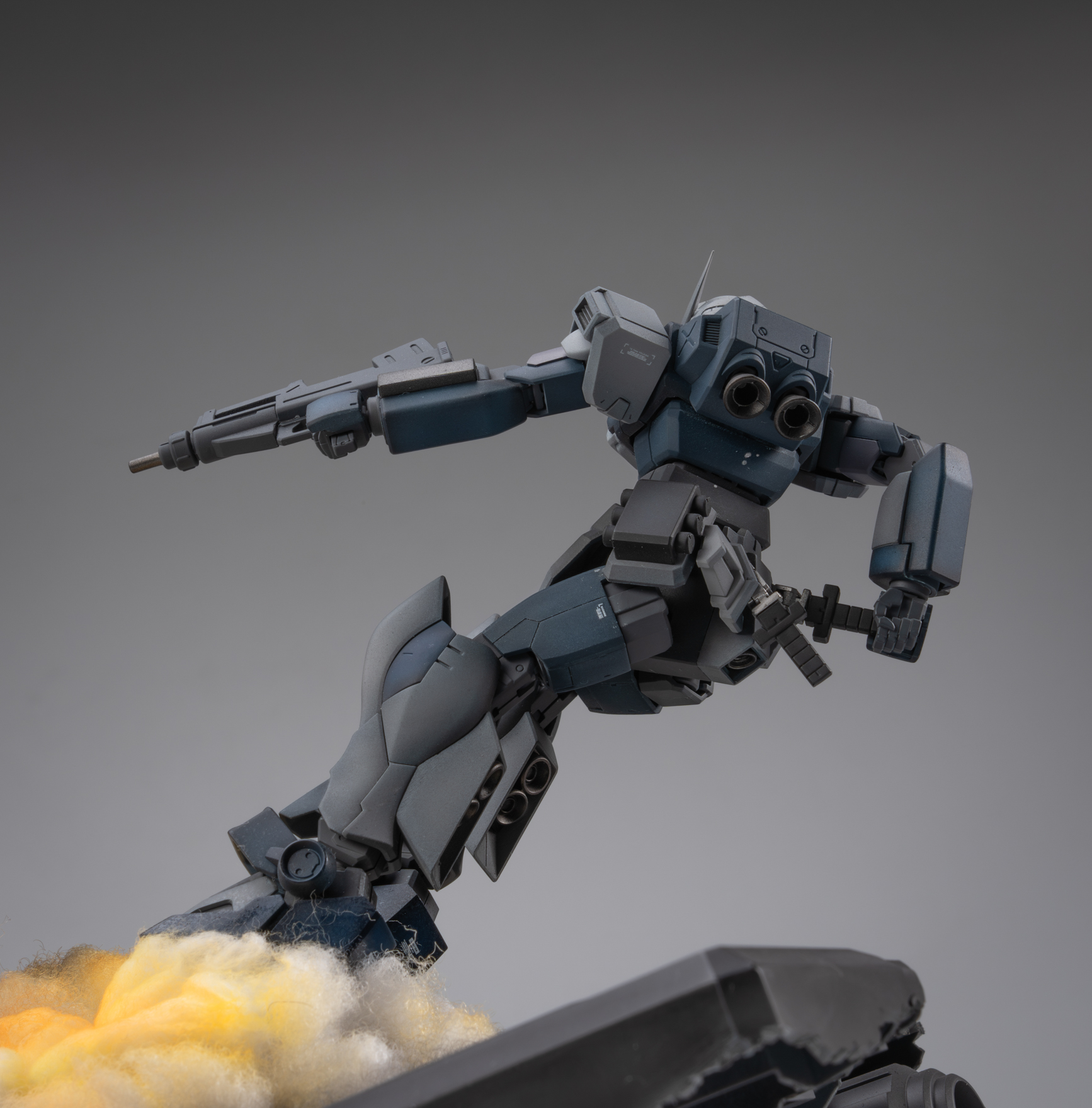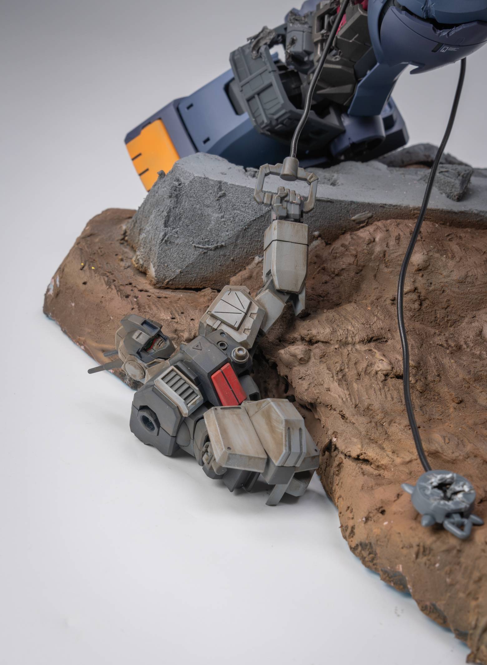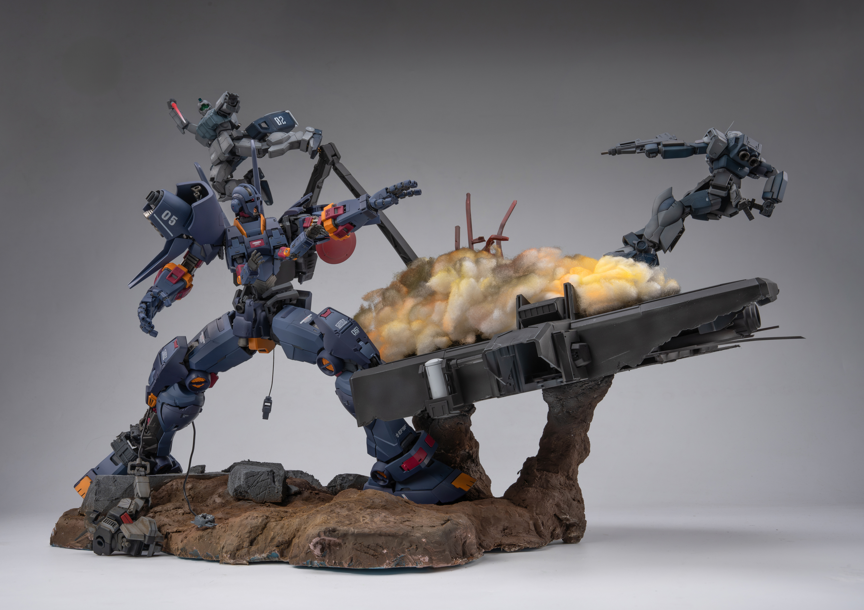 背景故事 以作品《missing link》为背景,想象在架空世界平行宇宙中,奴隶幽灵的远程火力支援机驾驶员“bomber”逃往宇宙后,在中立殖民卫星作为难民生活,在uc0087年又一次见证提坦斯的镇暴吉姆驱赶难民向难民开火后,他回忆起了曾经被吉翁与联邦同时追猎的经历。梦中,屠杀平民的吉姆以他心中最恐惧的姿态出现在曾经的战场,联邦的白色死神和吉翁的最终兵器融为一体,以铺天盖地的恶魔之躯袭来,经历奴灵的大破与基地的受损后,面对以高机动性与巨物缠斗的精灵高达,战斗的勇气终于战胜了一直以来的怯懦,在恶魔的注意力被精灵高达吸引时,吉姆借助一次性的飞行装置跃起,拔出光束军刀瞄准眼前的敌人,发起了最后的冲锋 “他们是猎物,我们才是猎人” 改造思路 陆战吉姆改造 混搭使用 hg pb奴灵陆战吉姆 hg 陆战高达 hg巴巴托斯第六形态 hg pb红色三巨星小队 hg pb苍白骑士陆战型 rg 吉翁号 将原吉姆的降落伞背包推进器配合rg吉翁号喷口制作挂载在腰间的复合飞行装置 大量填偷胶 将脚底纹路重新刻线制作 胸甲用ab补土重新塑形 达到类似乔巴姆装甲的效果 腿部加长3mm 大腿加粗1mm 达到更壮硕的比例效果 脚部重新塑形制作卡味铲子脚 部分细节削除 设计制作一定量刻线 整体无缝阴影喷涂 奴灵高达剪取上胸部分进行无缝阴影喷涂旧化 精灵高达改造 混搭使用 hg 精灵高达 hg 陆战高达 hg马克兔 hg 狙击吉姆 hg 死神 hg z hg 红色三巨星小队 rg能天使 胯部替换成死神高达的胯部 增高1mm的同时获得了可观的弯腰可动 同时将肩甲替换成狙击吉姆的肩甲使比例更轻盈小巧 使用能天使的后裙甲结构将光束匕首挂载在机体后方 侧裙甲则替换为红色三巨星小队的榴弹 加装狙击吉姆和z高达的喷口使其更符合高机动近战特化机体的设定 裙甲用马克兔裙甲重新塑形 整体线条更流畅 部分细节削除 设计制作一定量刻线 整体无缝阴影喷涂 增加分色 吉翁号改造 混搭使用 rg 吉翁号 rg 元祖2.0 hg 强袭杰刚 hg 铁奥 hg 拜亚兰特装型 hg 海军陆战队格鲁古古 mg 原石新安洲 mg 吉姆狙击特装型 mg 元祖3.0 mg gnx进阶型 mg 格鲁古古2.0 mg age1标准型 pgu 元祖 主要改造是将rg吉翁号加上pgu元祖的腿 用ab补土重置关节以保证可动与造型比例 在胸口加装rg元祖2.0的手臂 呼应改造的主题 将多款套件的内构进行混搭呈现出比较饱满的外露内构造型 上半身使用拜亚兰和铁奥的零件视觉上扩宽比例 部分细节消除 设计制作一定量刻线 整体无缝CM喷涂 场景制作 混搭使用 pg 能天使 pgu 元祖 pg 独角兽 pg 完美强袭 hg 强袭杰刚 hg 铁球 hg 海因德里 hg 陆战吉姆奴灵机 hg 拜亚兰特装型 mg 原石新安洲 mg 元祖3.0 mg 自由2.0 mg 杰斯塔 以泡沫板搭建第一层框架 以pg能天使地台搭建基地场景 以pg完美强袭背包机械臂,pgu元祖核心战机,mg自由2.0支架,hg海因德里进行混搭