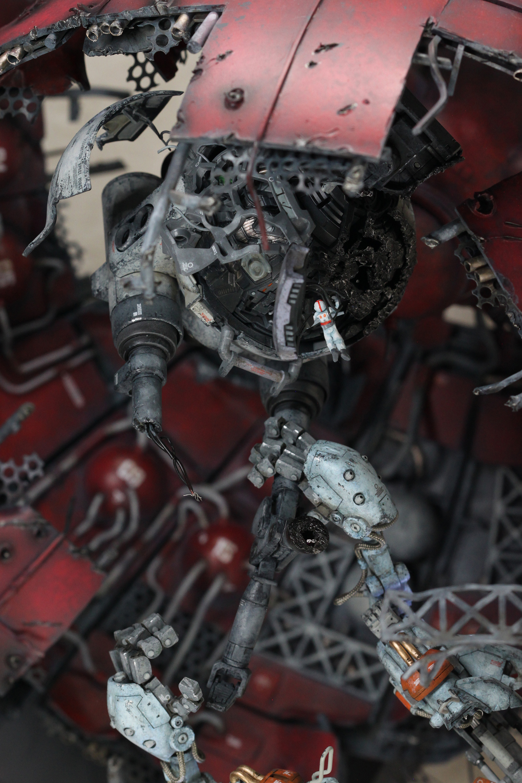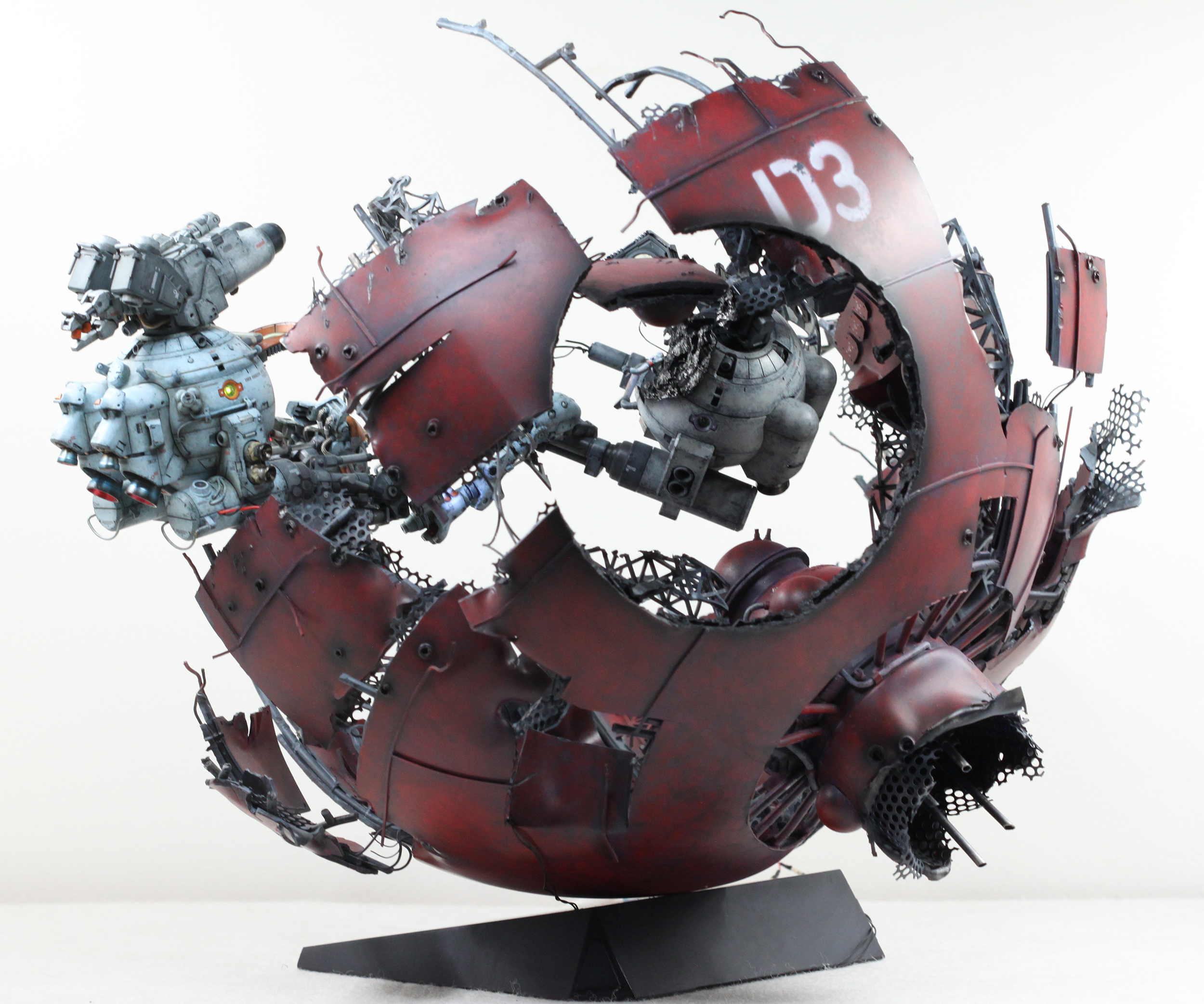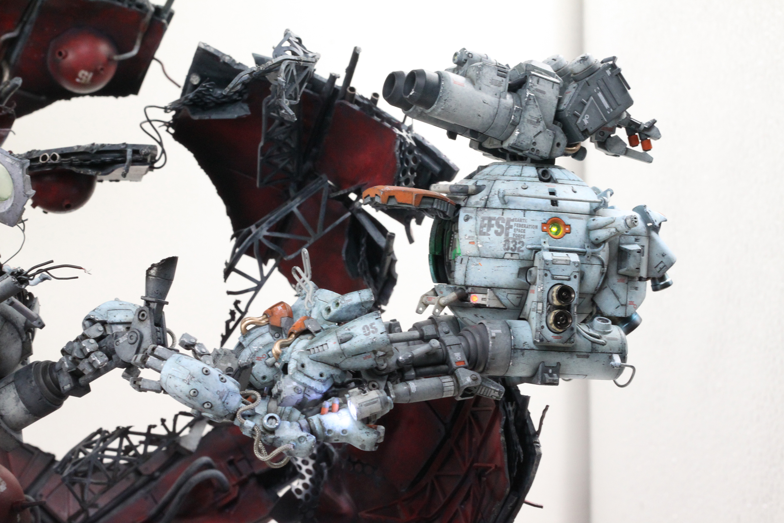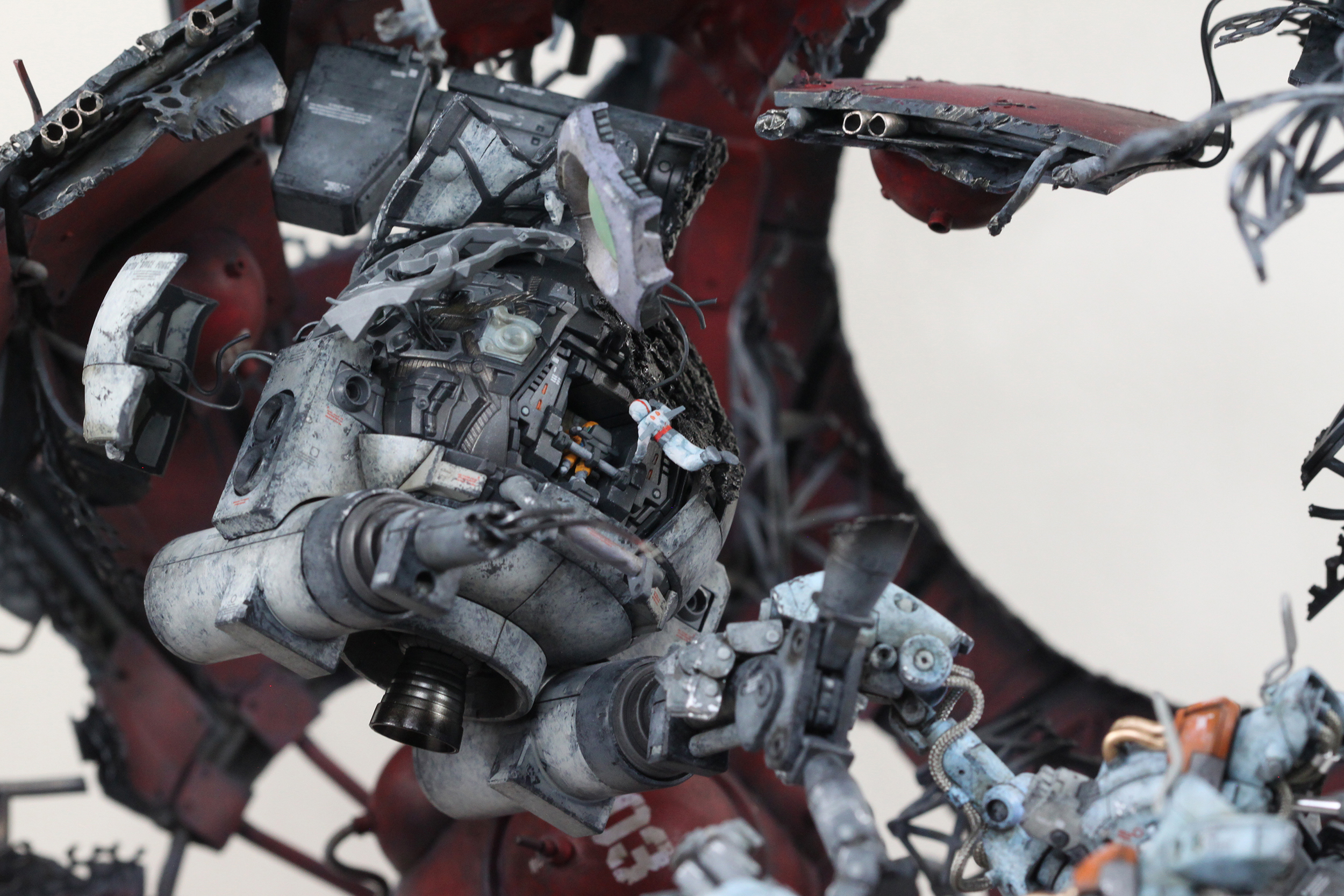 该作品主要描述一台RB-79铁球特改型(自设)进行旧战区清理的情景,该战区主体为吉翁军格瓦金级战舰的一只动力球囊的残骸,在其中发现了一台旧型号铁球及其驾驶员的遗体。作品的主题旨在描述战争的残酷:双方俱残的战后情景下,探查员正在接触的遗体和机体残骸正与自己极为相似,而动力球囊的残骸散布成一朵红色的死亡之花像是正在从花蕊孕育出这种诡异又静寂的场面。