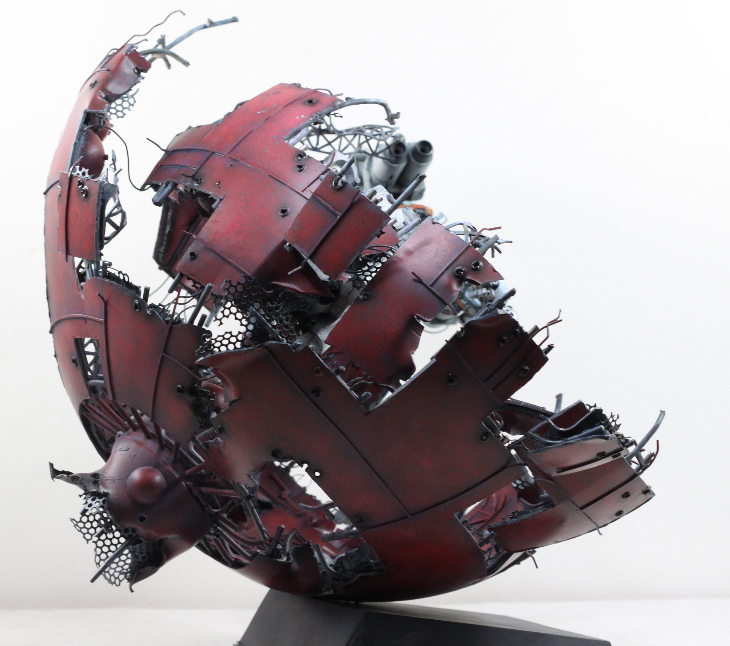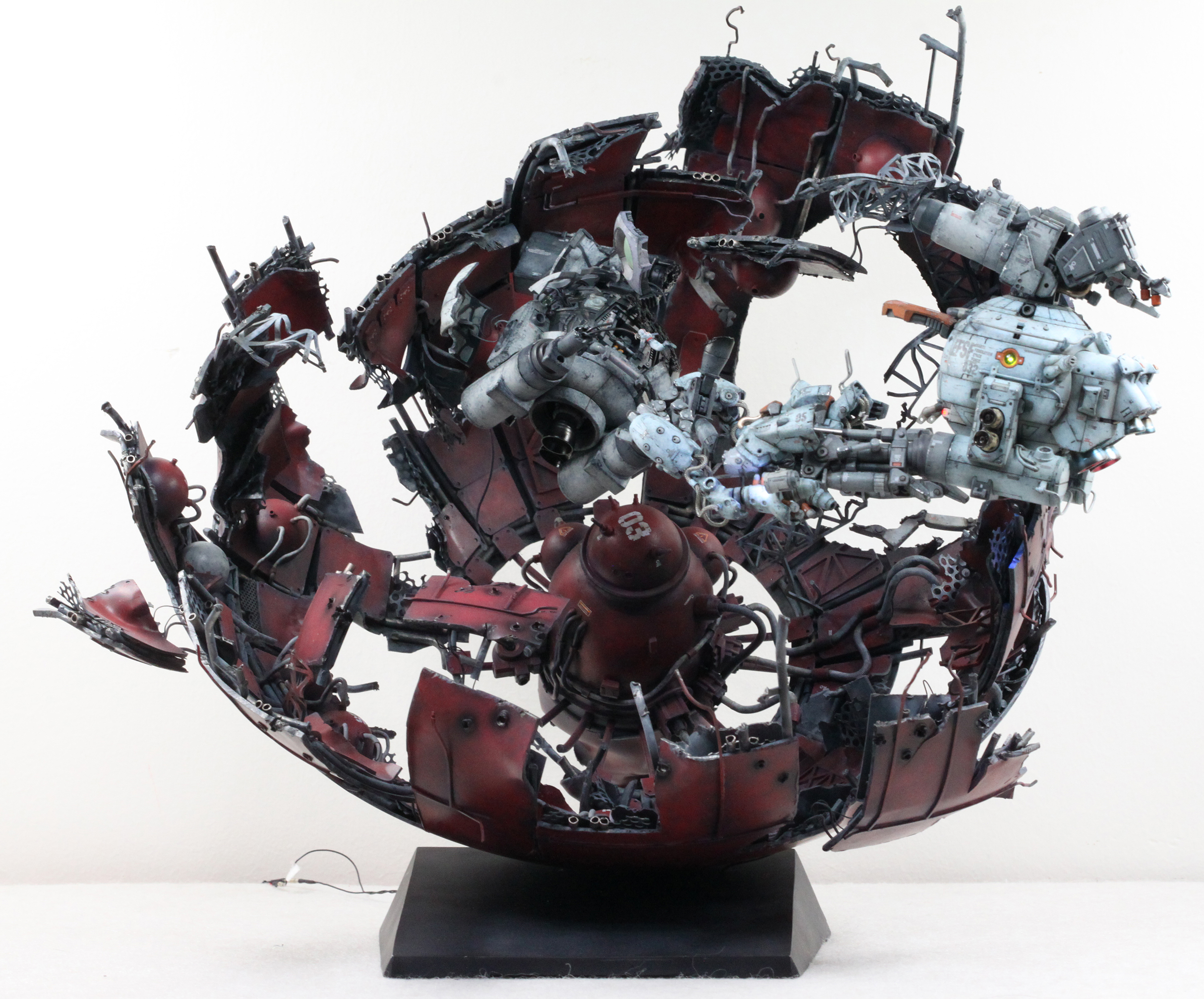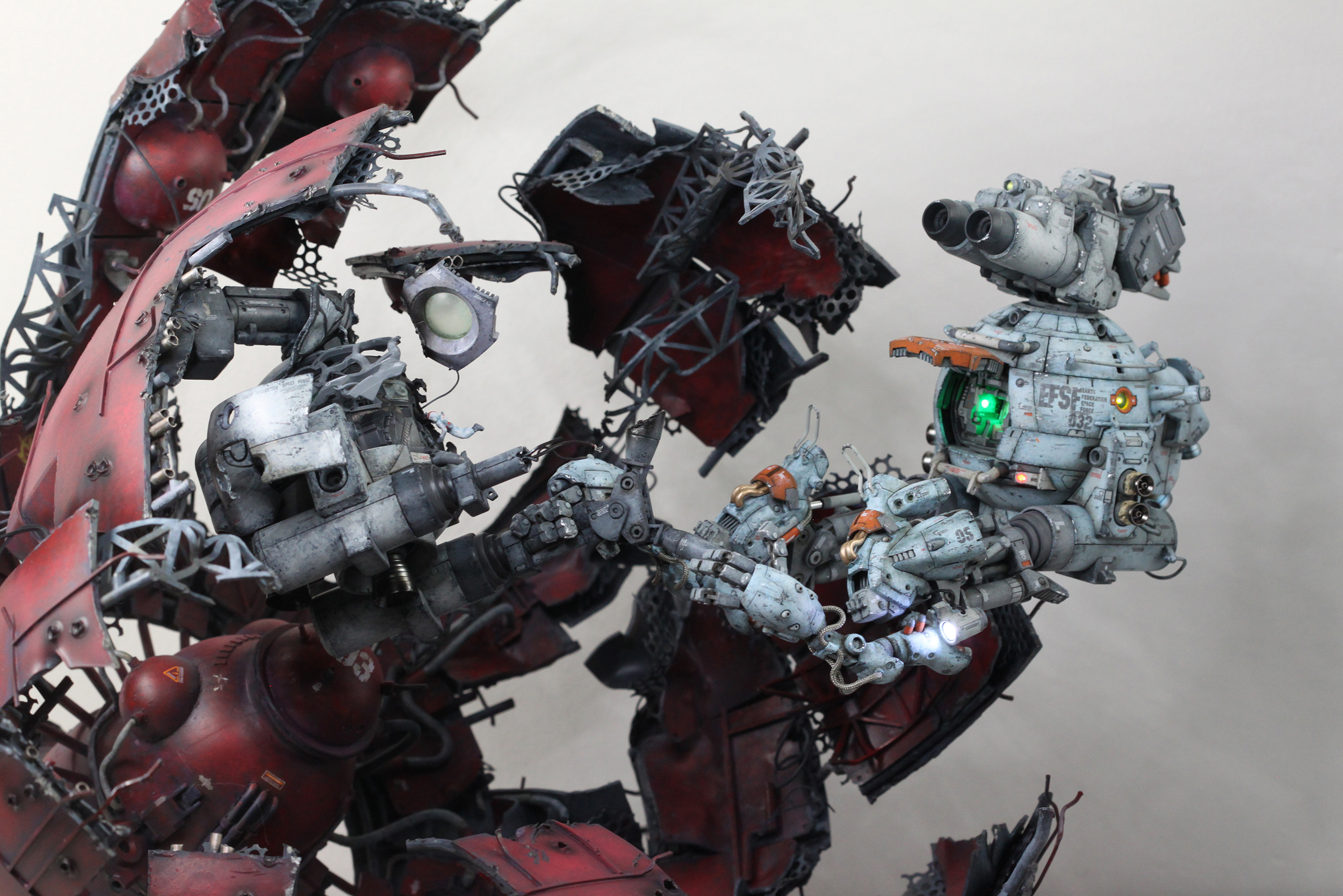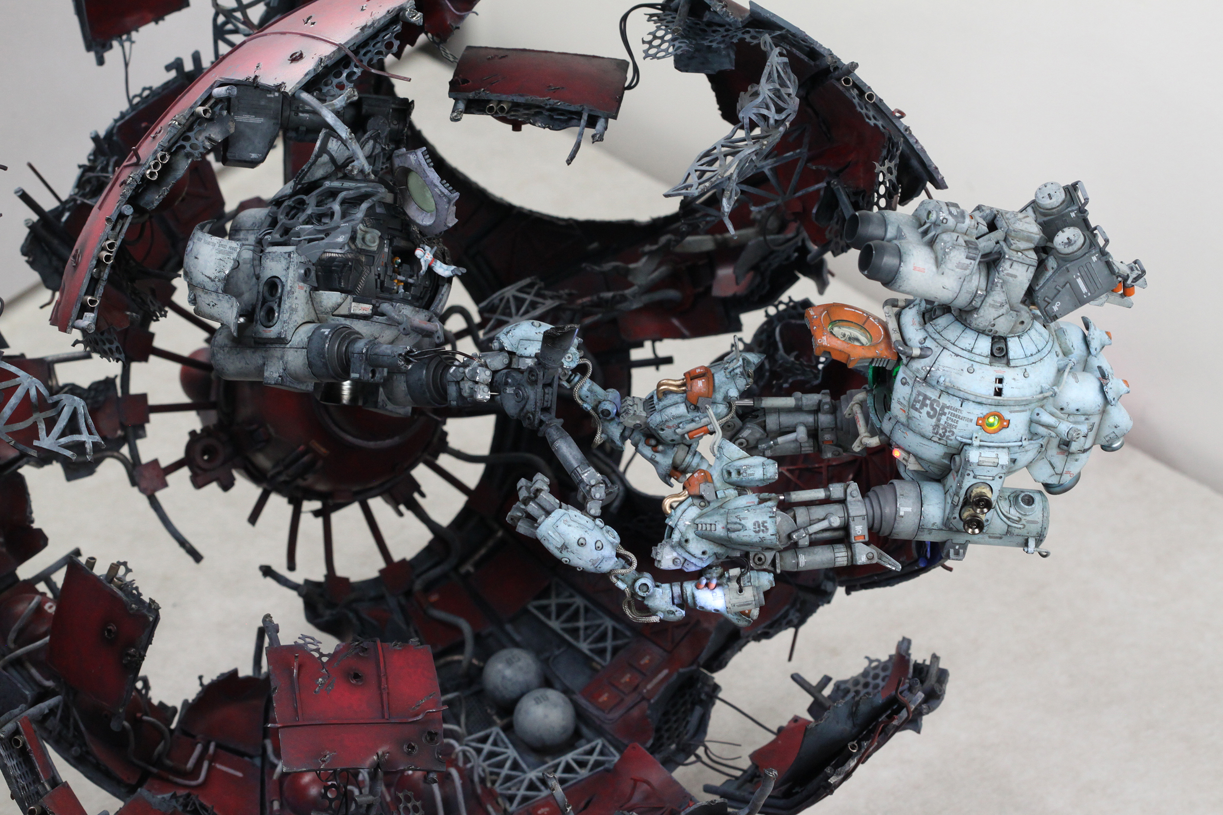 该作品主要描述一台RB-79铁球特改型(自设)进行旧战区清理的情景,该战区主体为吉翁军格瓦金级战舰的一只动力球囊的残骸,在其中发现了一台旧型号铁球及其驾驶员的遗体。作品的主题旨在描述战争的残酷:双方俱残的战后情景下,探查员正在接触的遗体和机体残骸正与自己极为相似,而动力球囊的残骸散布成一朵红色的死亡之花像是正在从花蕊孕育出这种诡异又静寂的场面。