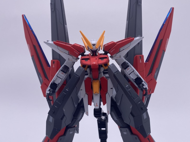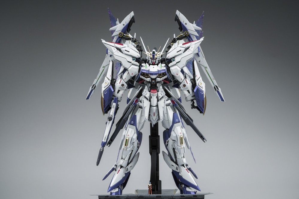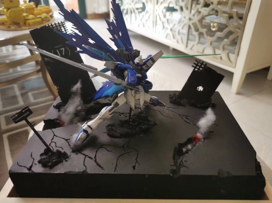 因为幻影高达和命运高达都有炫酷的的光翼所以突发奇想把命运改成了幻影的样子,为其命名为命运之影,光翼特效件喷涂了金属蓝和金属紫的渐变,光束军刀喷涂了白色和金属绿的渐变,整体色调为蓝色