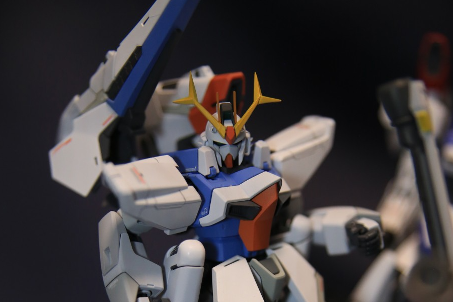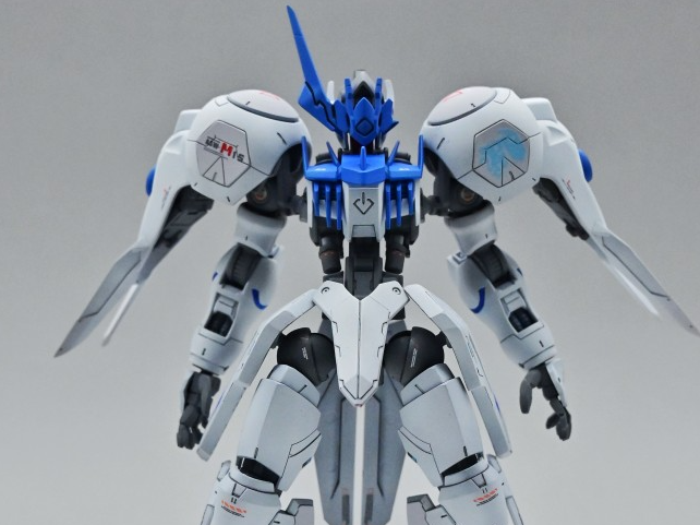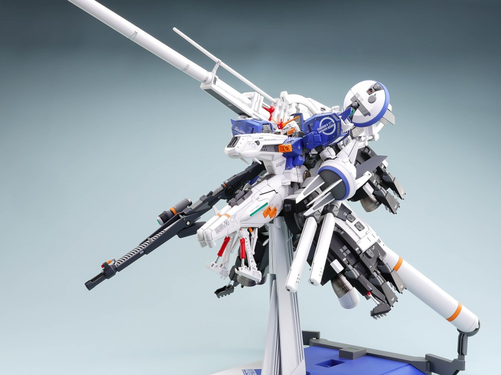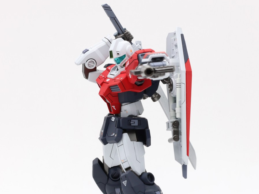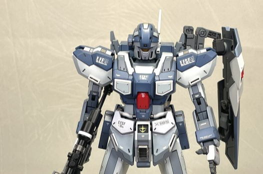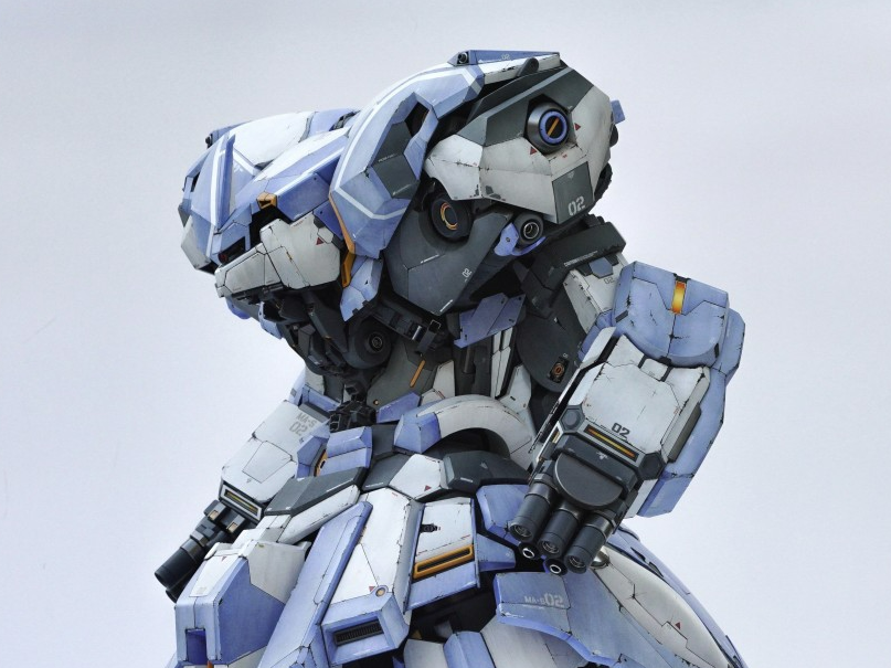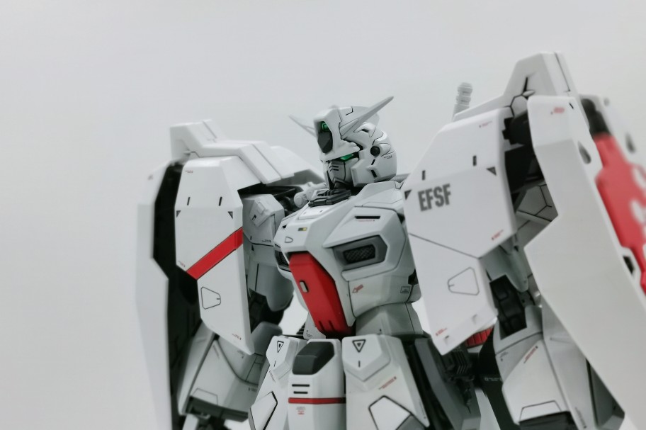 设定为原型机实验型,双肩盾防御拉满,为满足重装高机动,腿部和屁股增加大量喷口,燃料罐保证续航,同时也在机体多处增加散热细节。装备损毁可卸掉转换轻装模式,战斗时监视器会由绿变红。套件使用F90多个装备混搭完成,主题配色使用两种白色,整体添加非对称红色条纹点缀。