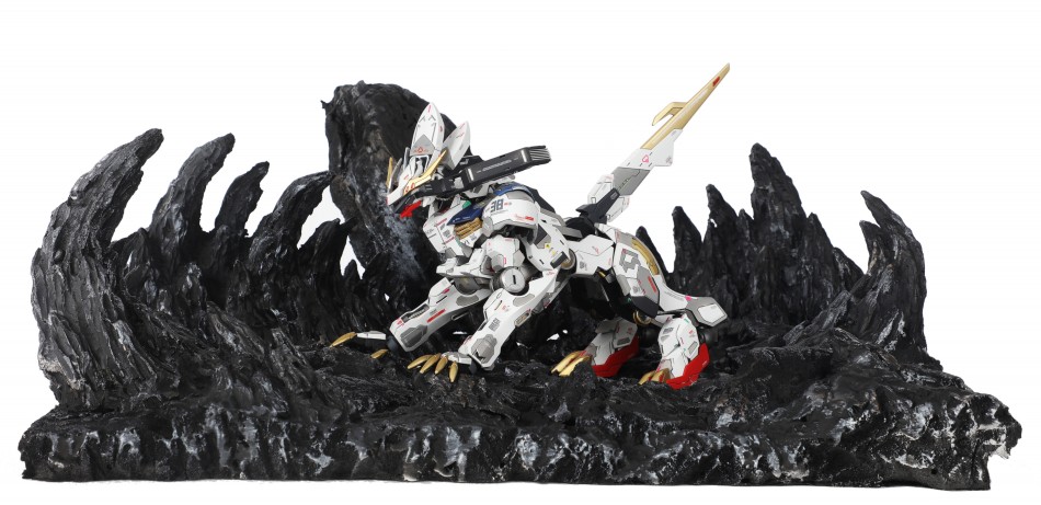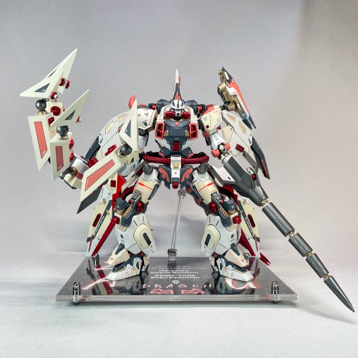 本作品用了扎古幻影·雷专用机、艾比安高达和锡蒙力维达尔高达的部分零件制作而成。右手臂采用了锡蒙力维达尔的腿部,显得更有力量感;右手用胶板自制而成,拥有无与伦比的破坏力;左手武器采用了锡蒙力维达尔的长矛,分裂之后拥有了旋转的能力,使得破坏力更强;尾部使用了四条艾比安的小腿,自制连接件衔接而成,非常具有力量和破坏力;背部的翅膀和身上各处的喷口为这台看似笨重的机体提供了强大的机动性。