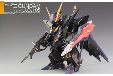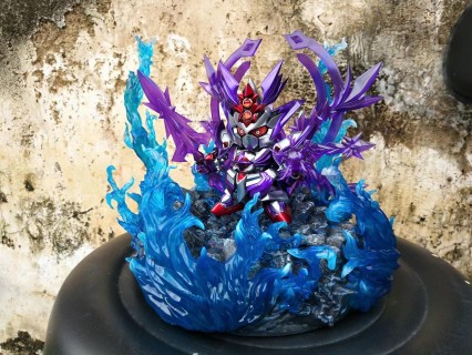 作品使用了万代1/144 拼装套件与BB 柯西高达拼组套件进行改造而成,颜色参考海盗高达2号机的暗黑紫配色,增加机体的“叛逆”感,作品将柯西进行SD化,避免因144比例改造造成的头大身小的外观,保持三头身的比例以让视觉上更加平衡。
