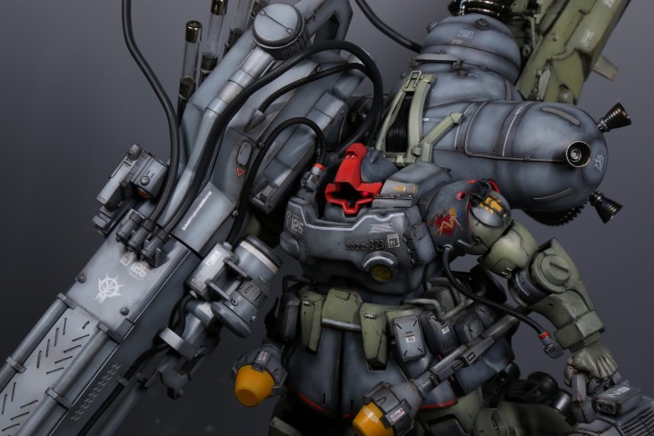 记得当年看高达UC的时候,特灵顿攻防战那段尤姆·卡克斯的狙击扎古映像特别深,纯爷们,真军魂。所以这次尝试着将整个狙击的场景还原出来。这次采用全笔涂的方式制作,机体方面使用万代HGUC的尤姆·卡克斯专用扎古,机体的可动和细节还是很讲究的,能很好地还原动画中的射击姿势,细节上没有做大的改动,替换了金属天线增加了一些外露的线路,尽量还原机设的形象。涂装上进行了大胆的旧化,毕竟是老兵机岁月的痕迹还是需要体现一下的。机舱的制作考证参考了动画中的一些画面和现实运输机的细节,狙击扎古搭乘的应该是一架改装过的 胖叔叔(Fat Uncle) 运输机,因为没有具体的数据所以只能根据动画中为数不多的一些画面对具体比例进行推测。扎古身上的4条固定绑带是必须要还原出来的,用了纺织布切条,在加上1/24的赛车安全带蚀刻片修饰细节,呈现的效果很满意。机舱的内壁参考了现实运输机的结构,增加了些管线,排风口,应急逃生门等,还有动画中的防滚网也使用纺织布和蚀刻片进行了还原。地上替换下来的过热枪管也是亮点,必须还原,枪管的两头根据冷却的时间长短进行了不同程度的涂装展现高热的样子,其中一根做了熔毁的处理。操作台上添加上1/144的兵人让整个场景更加生动。机舱的外壁仿照科幻战舰的外壁进行了刻线,配上超大基恩LOGO很霸气。