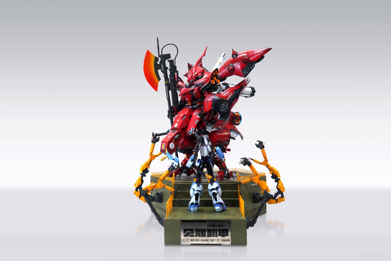 灵感来源高达AOZ的TRS系列设计风格,使用「HG NZ-999新吉翁号」作为主体改造,利用「PG RX-178 」骨架作为核心支撑调整比例。使用二十余套各系列高达模型零件进行混搭配合部分自制外甲所制作的机体。机体全身各处都进行了比例调整和细节添加。 作品尺寸:H:48.3 W:39.8 L:49.2(CM)