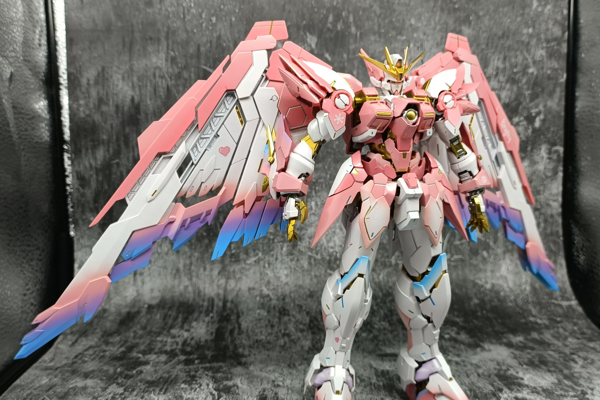 尊敬的各位评委: 您好! 模型并没有走常规的风格,别人有的旧化战损、有的原色喷涂、有的狂野爆改……而我的却是粉嫩嫩的,卡通感很浓,也许,是不喜欢那种浓浓的机甲风,浓浓的战争风吧。 模型没有做过多的改造,只着手了一点,例如翅膀的弯曲可动幅度。模型的腿部简单延长了一下,原本以为短腿配粉色会很蠢萌,结果我错了,下半身太粗,上半身太细,所以才简单延长了一下。裙甲和肩甲部分地方把弧线磨成平的了,因为感觉主体的弧线和翅膀的直愣愣有些违和。配色上是以粉色为主,基本都做了一些渐变处理,搭配浅粉、浅紫、浅蓝的渐变,别有一番风味,紫色在中间是因为红+蓝=紫。骨架是浅金色为主,少量用银色做点缀。最后整体看上去满屏的浅色调,没有深的,这是因为某个女孩不喜欢深色。模型的渗线是用的水性漆涂上然后再擦拭得到的,用了金银蓝粉这4种色号,嘴巴上的金色渗线寓意着某个女孩在我这里“金口玉牙,说啥是啥”。金色眼睛寓意着“火眼金睛”,希望我不在的时候,某个女孩也可以看清眼前的事物。金色的枪,也许玩枪战游戏的人看了,会有种黄金ak的即视感。外甲采用了珠光质感,少女感、卡通感直接拉满。 如果问我爱情是什么,我经历过的故事告诉我,是彼此牺牲,彼此成就,是真心相待。就像这款模型一样,用爱去制作,也许唯有真心相待,才能做出一款好的作品吧。 我的简介到此结束,谢谢各位评委。