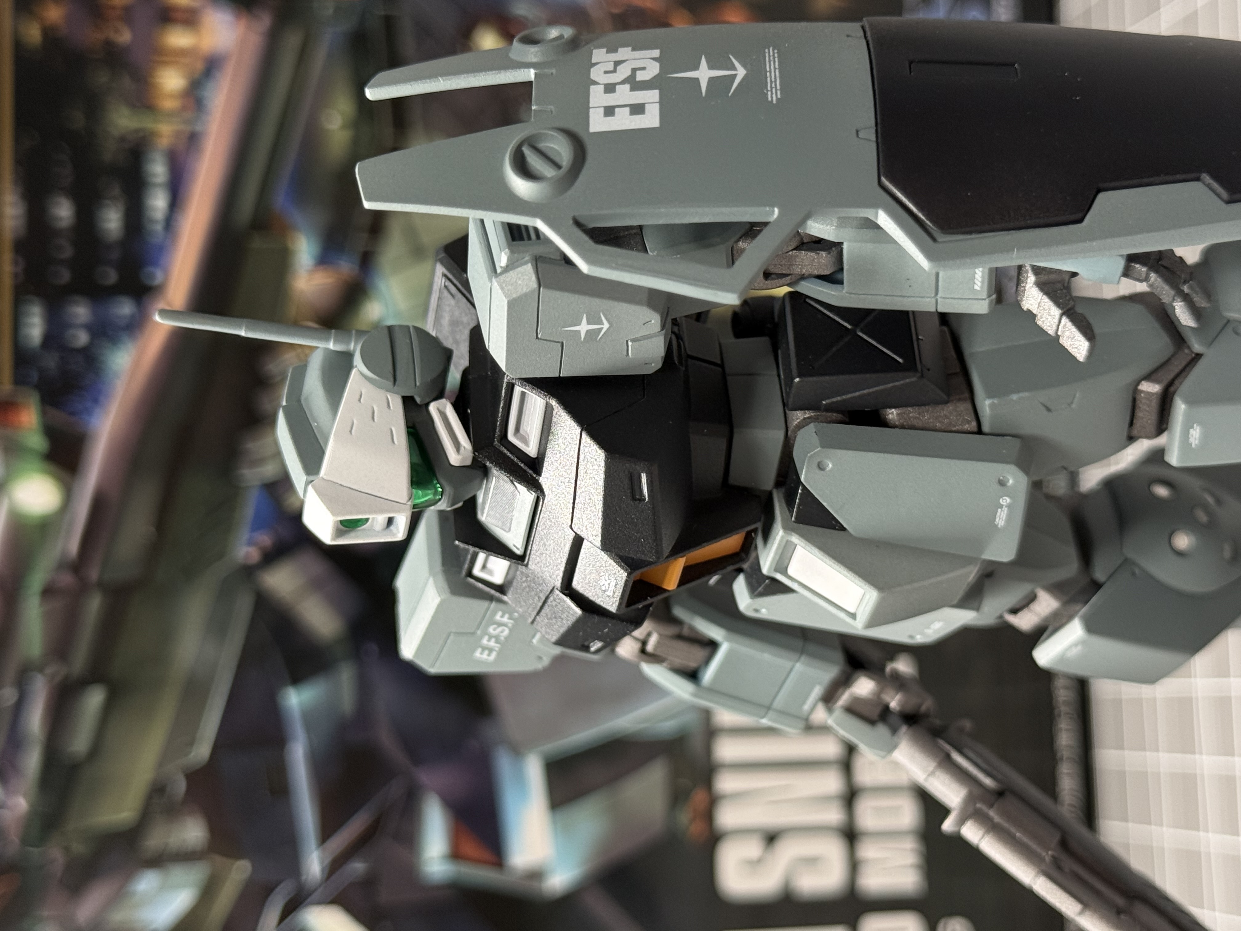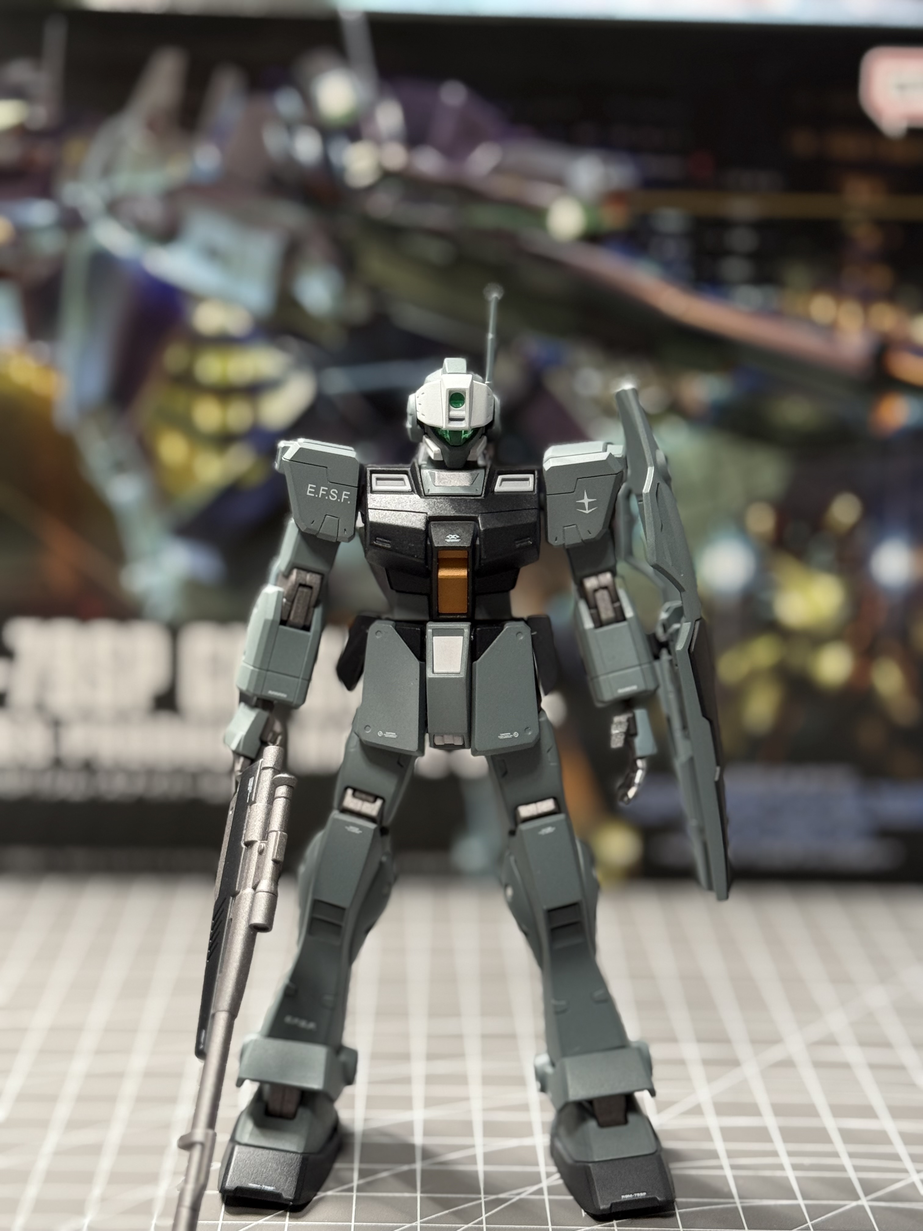 本机以hg狙击吉姆为基础,整体外甲以灰蓝色搭配黑色重新喷漆涂装,裙甲颜色与外甲相同视觉上拉长了腿部线条,肩部、胸部、腿部装甲新增了细节刻线,小腿位置圆形盖板重新钻孔并装上蚀刻片以增加细节