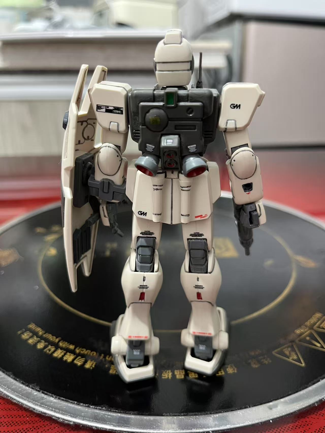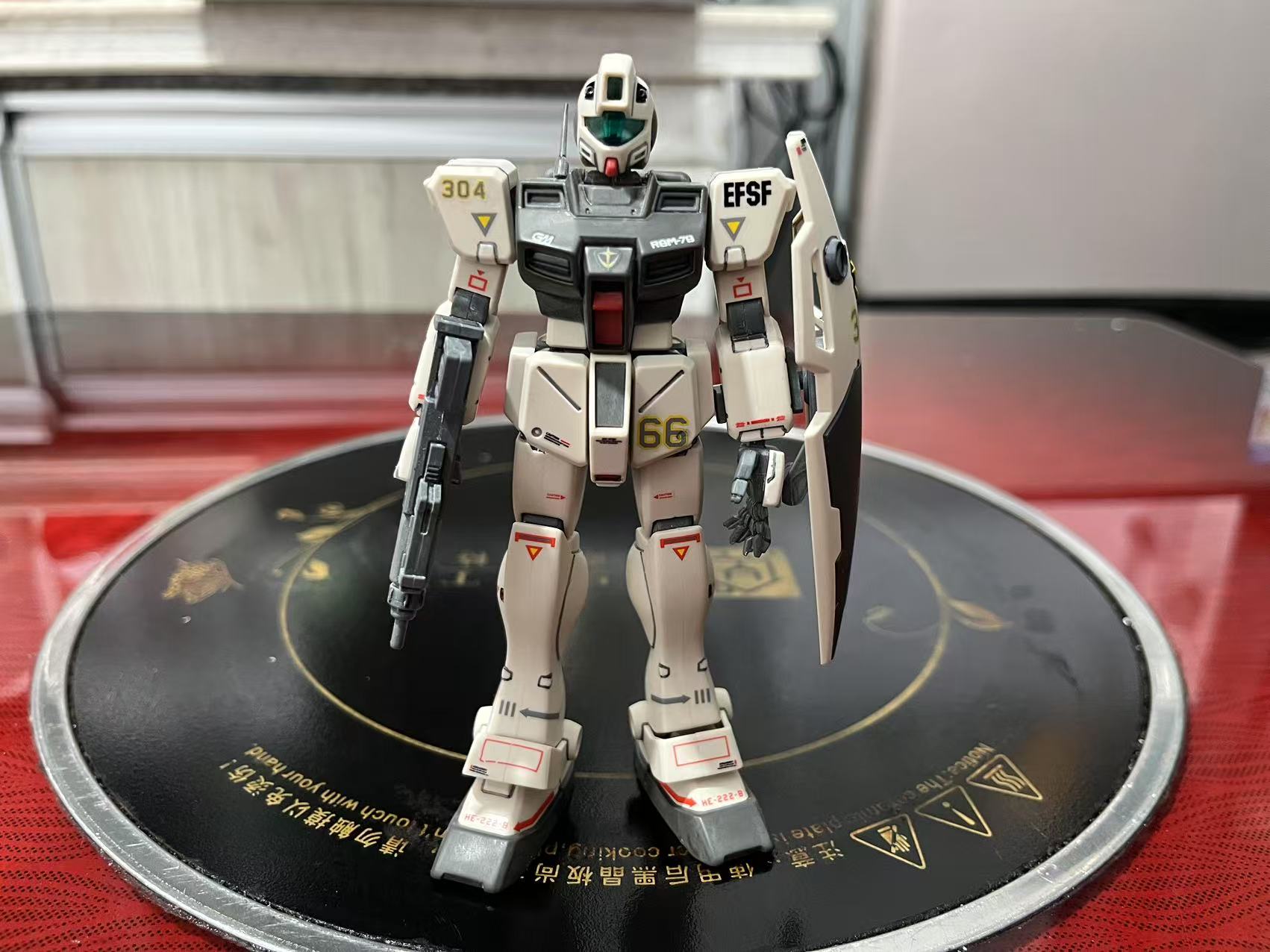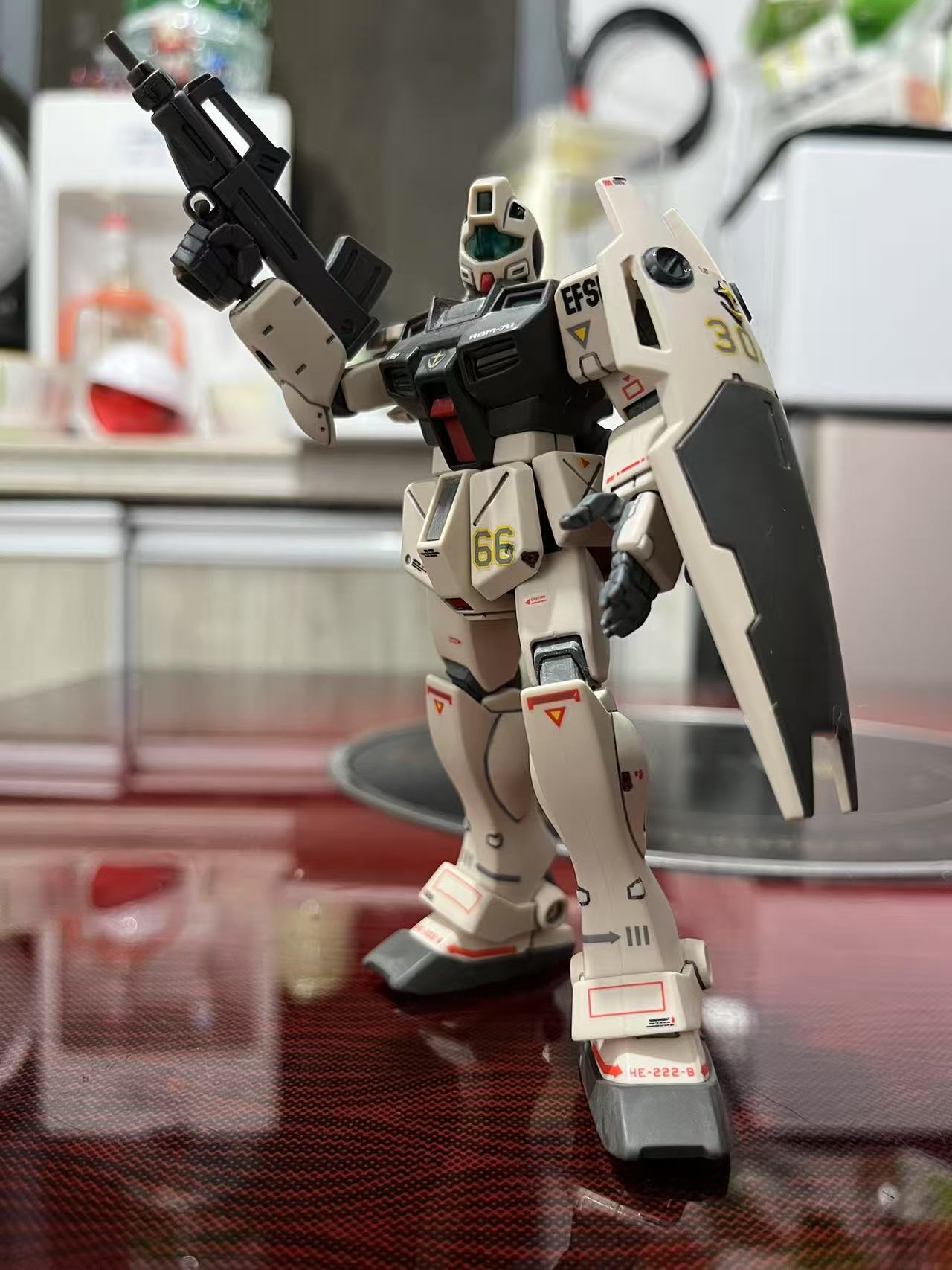 素组直做,用笔刀削除水口后,再用800号海绵砂纸进行全件打磨增加消光质感和水贴的贴合力,之后用高达马克笔进行补色,以及高达勾线笔进行勾线增加模型立体感,最后贴上万代地球联邦军通用水贴增加写集体信息量。