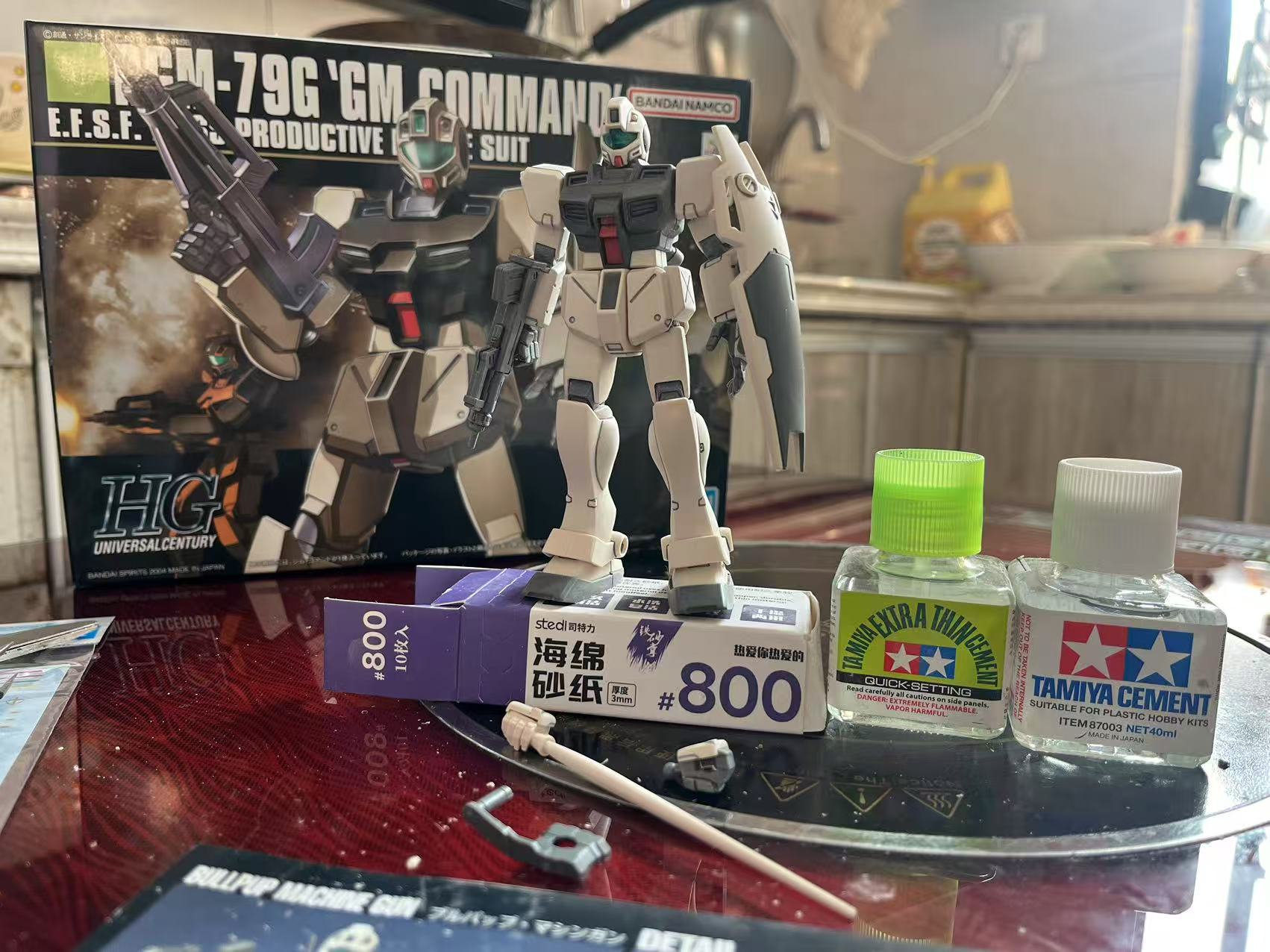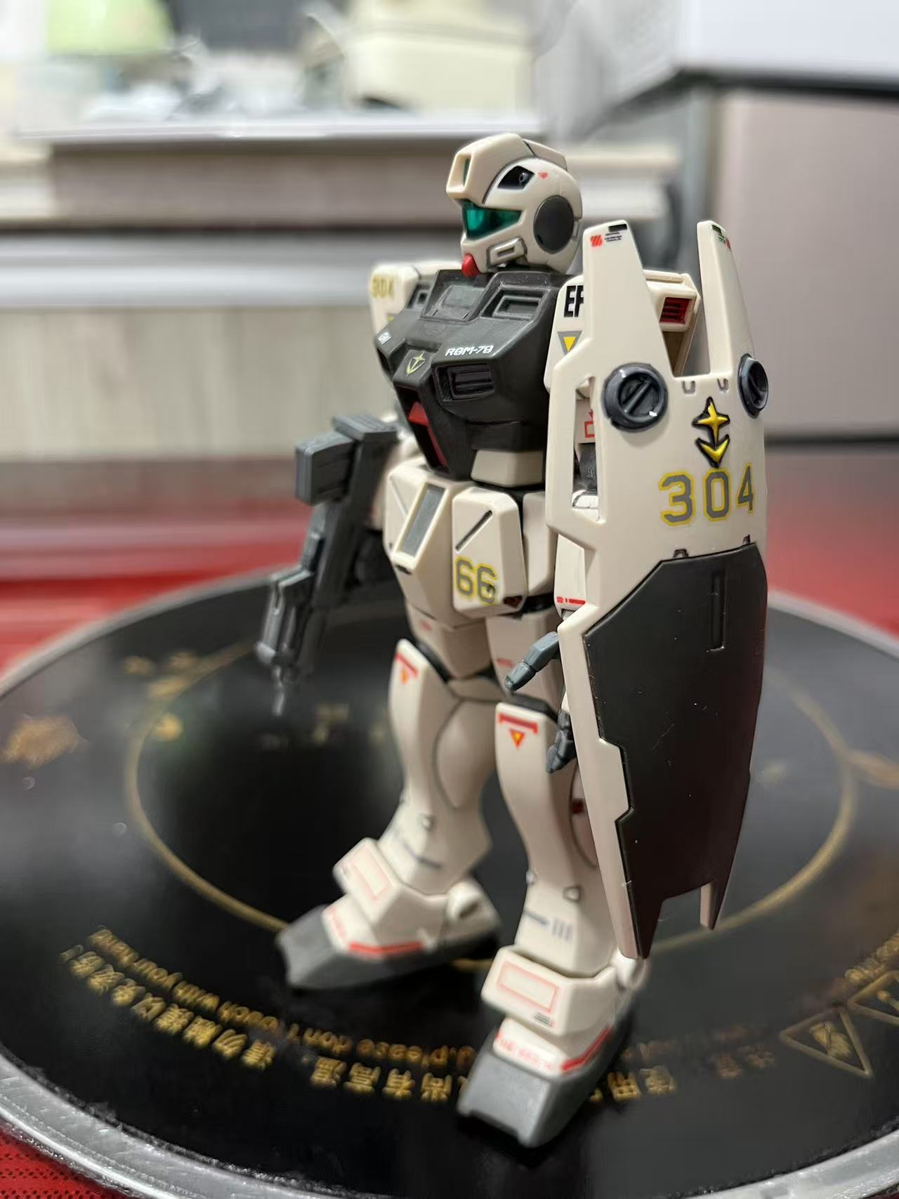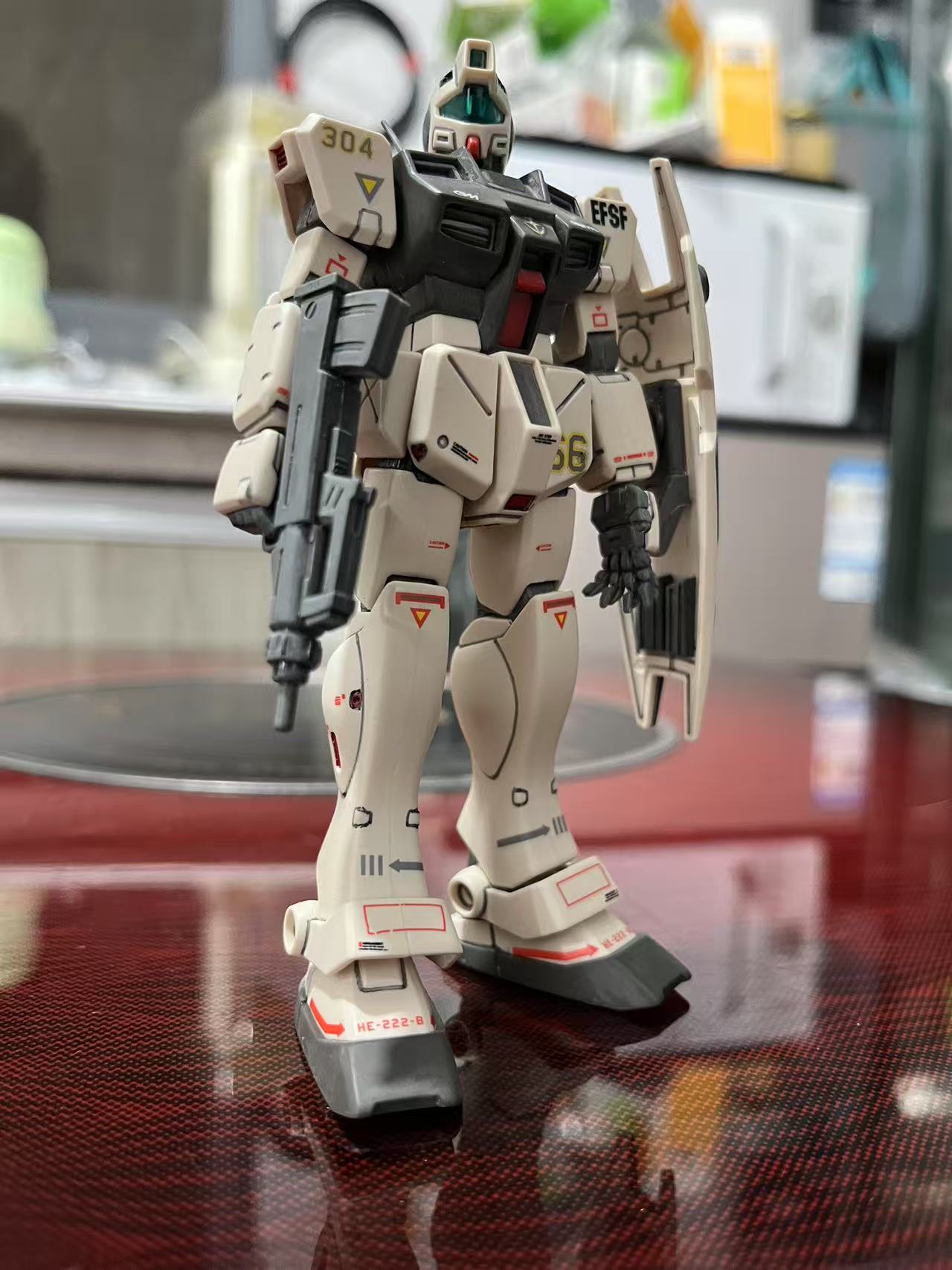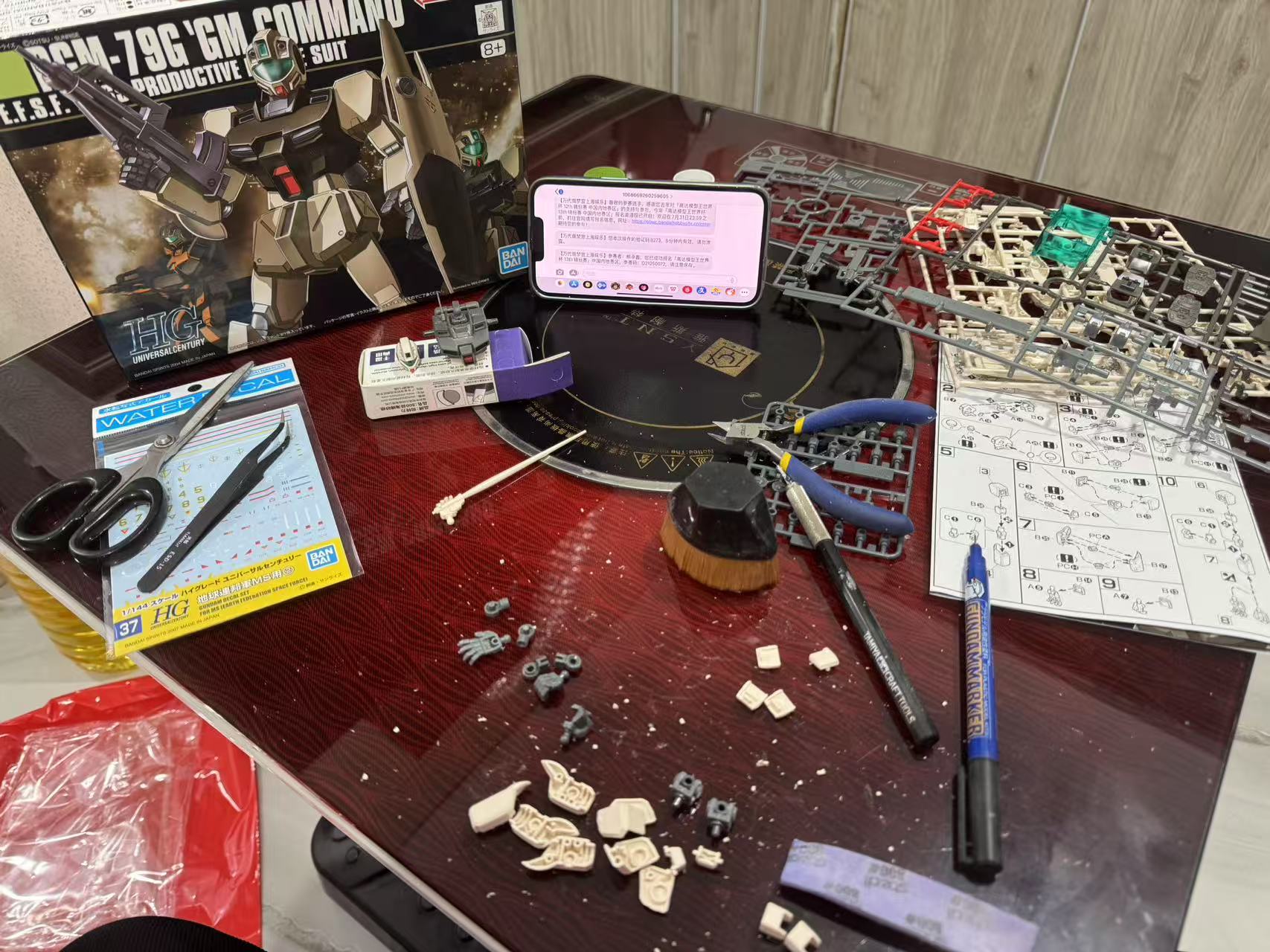 素组直做,用笔刀削除水口后,再用800号海绵砂纸进行全件打磨增加消光质感和水贴的贴合力,之后用高达马克笔进行补色,以及高达勾线笔进行勾线增加模型立体感,最后贴上万代地球联邦军通用水贴增加写集体信息量。