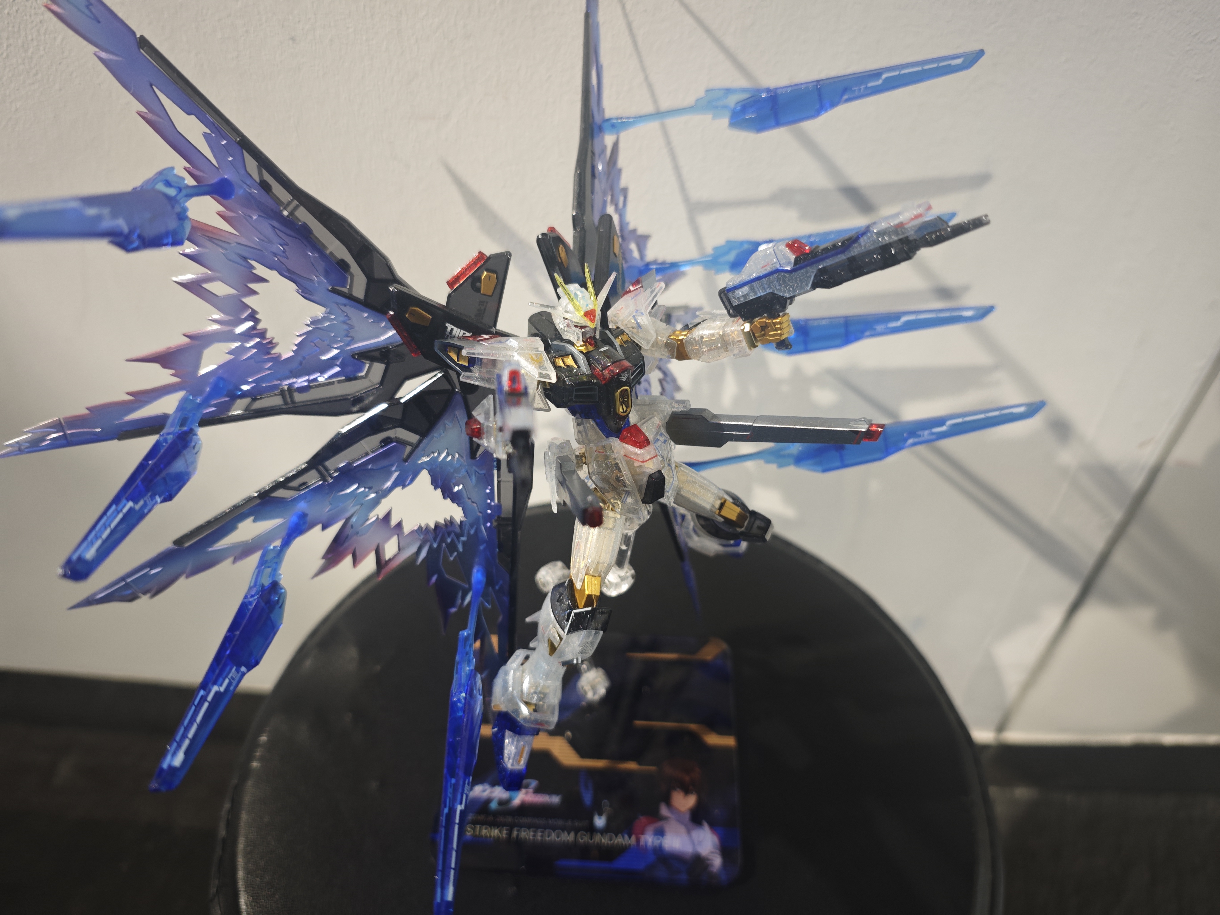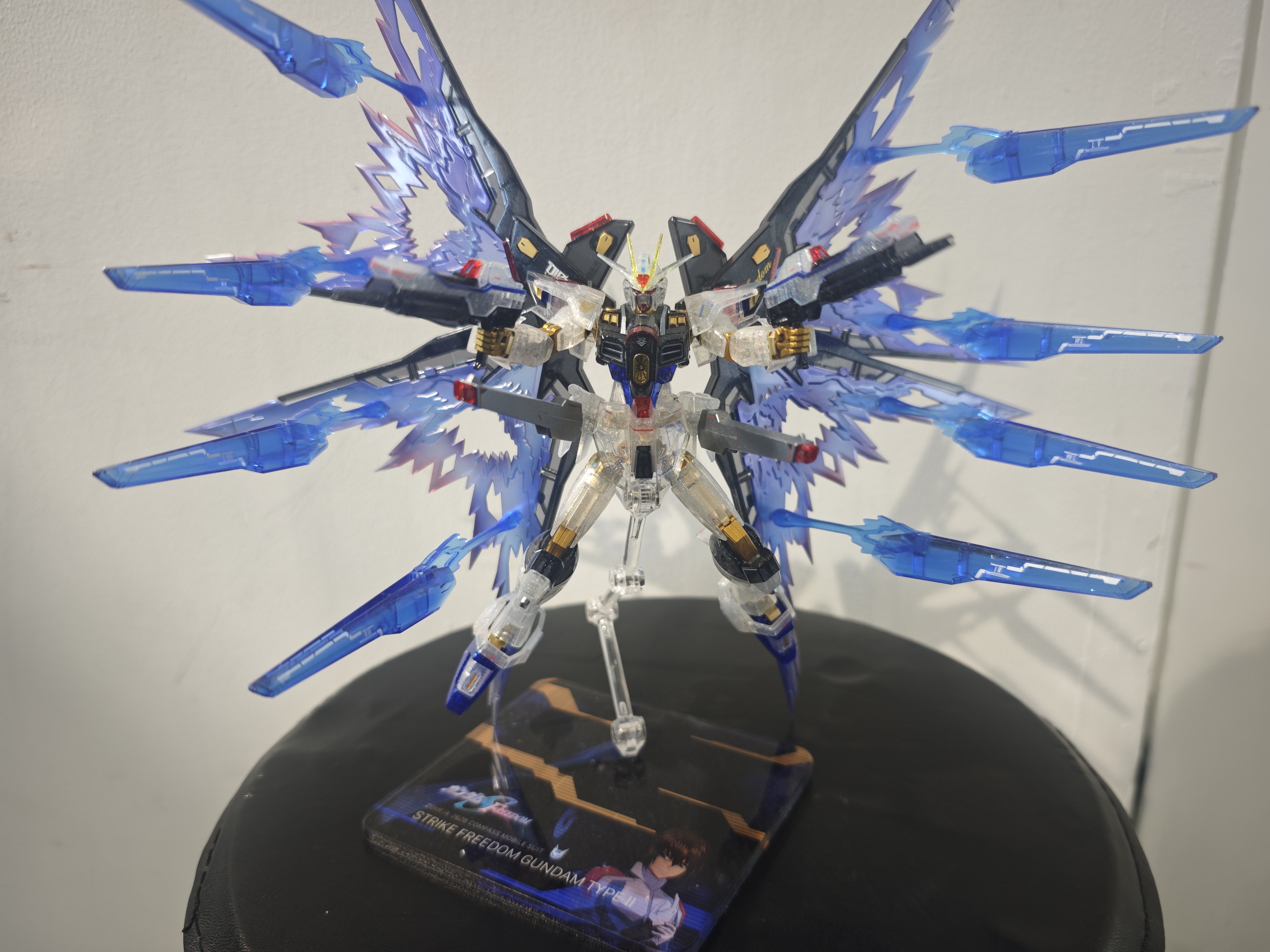 试用了蓝光附录非凡强袭自由的主体加上彩透强袭自由的背包,主体金色关节都重新喷涂了,背包加了闪粉,光翼也重新喷涂了。